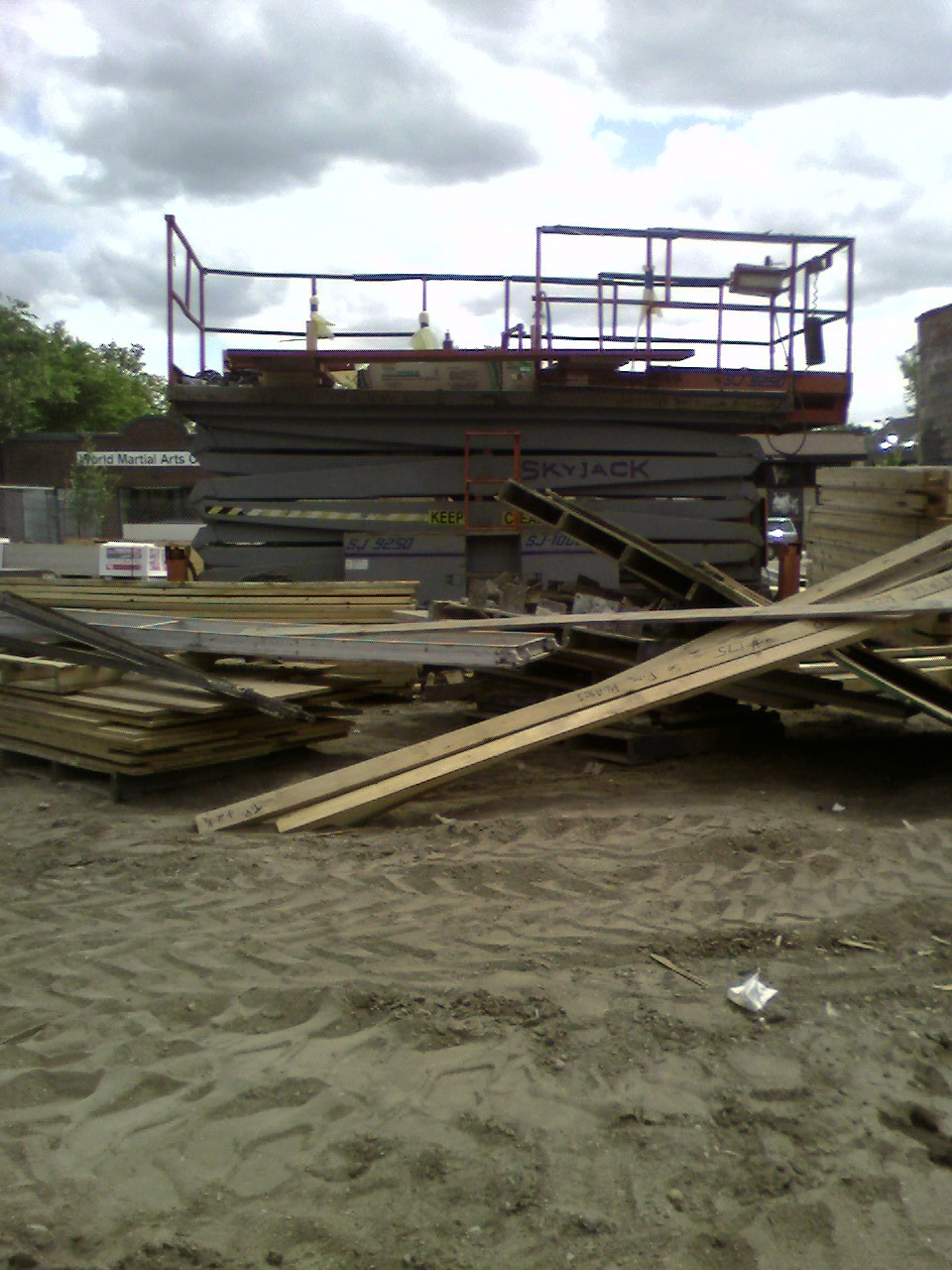 I waited about 5 minutes, lurking around the edges of the back entrance I had first come in, and then re-entered the lot. (I told you I was emboldened! Harry Lee had called me out! HARRY LEE. I had to get better proof so I could resubmit!) The guy who'd yelled at me was up in a huge machine, so I skulked down low, crouching and shuffling with mutt in tow, hiding behind stacks of lumber. Finally, I stood up and quickly got this shot of an unused SkyJack and a pile of lumber.