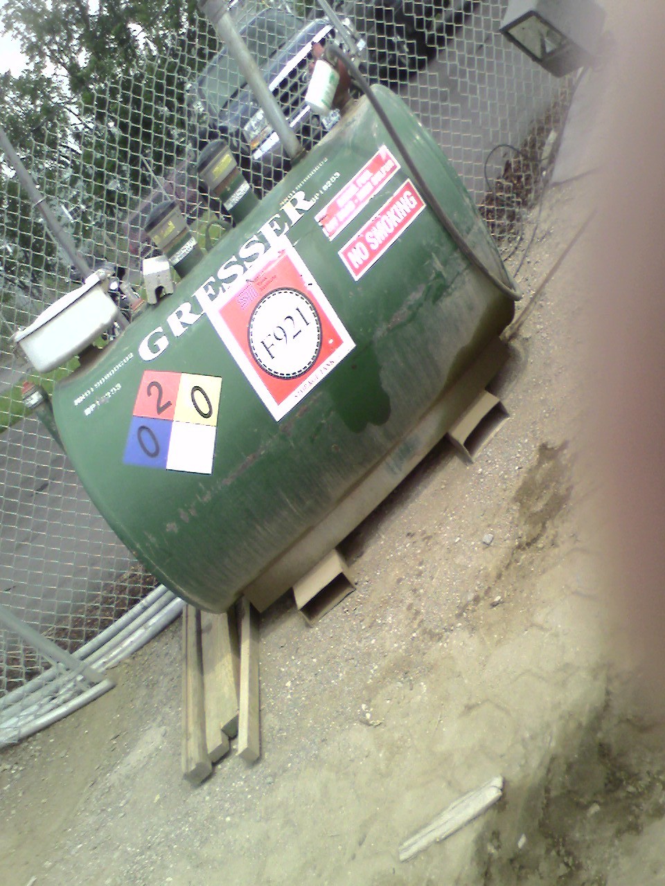 I liked the look of this green container vat thing, so I was snapping a picture...when a construction worker shouted at me from across the lot. "Hey, you can't be in here!" This is why the picture is a little warped. I must have jumped a foot.