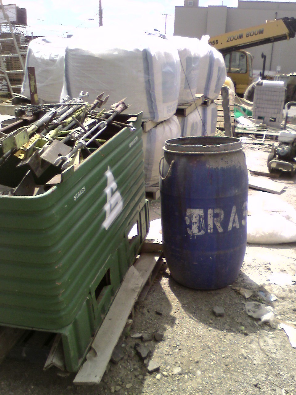 The guy in his big yellow machine started turning my way, so I ducked down again quickly and crouch-walked over to another spot. I got a picture of my hiding place: behind these barrels and piles of crap. You can see the big yellow machine in the distance.