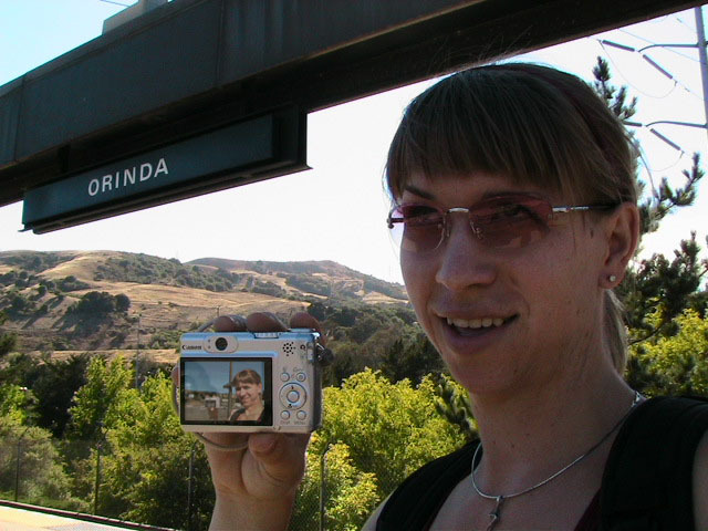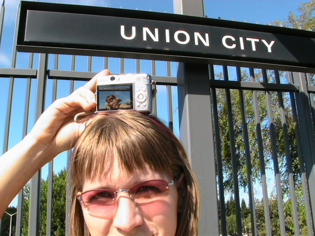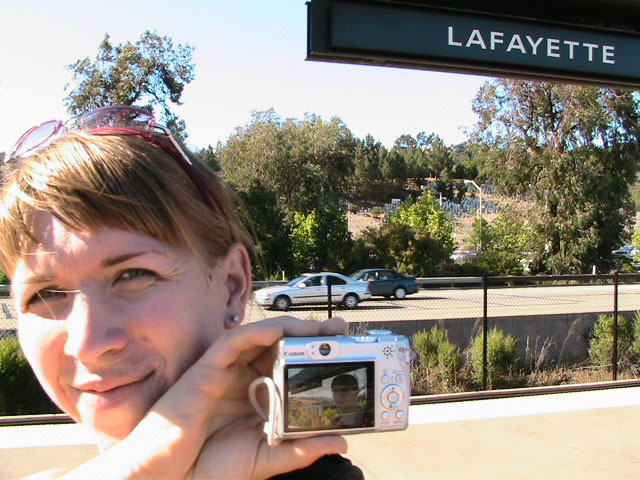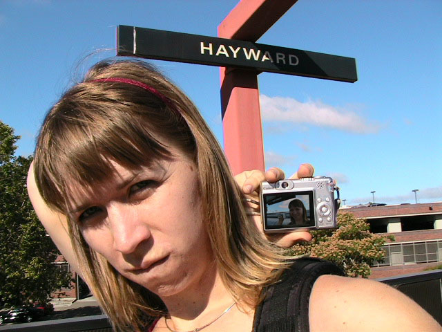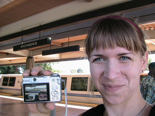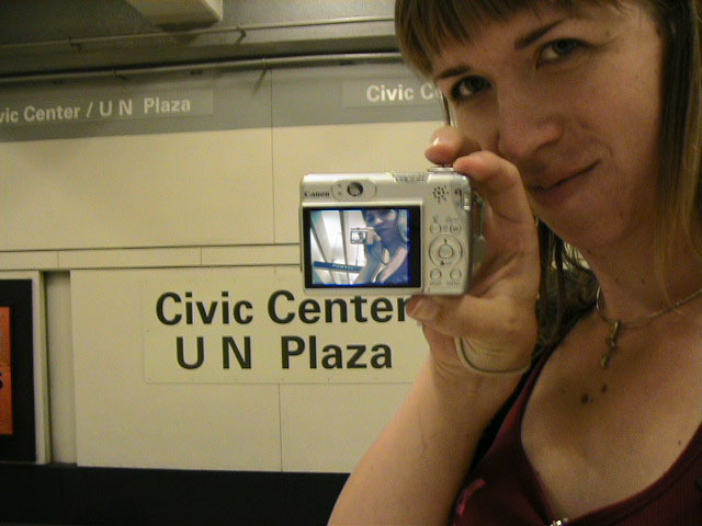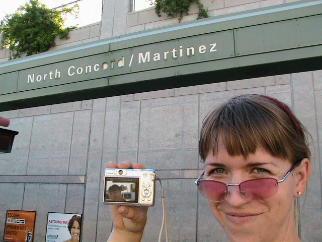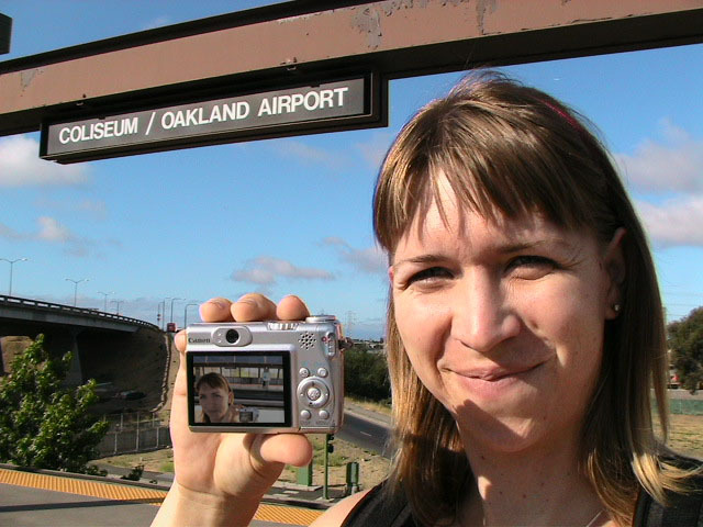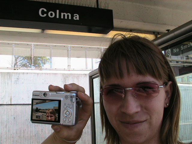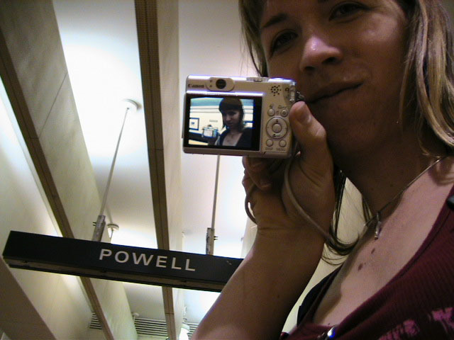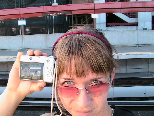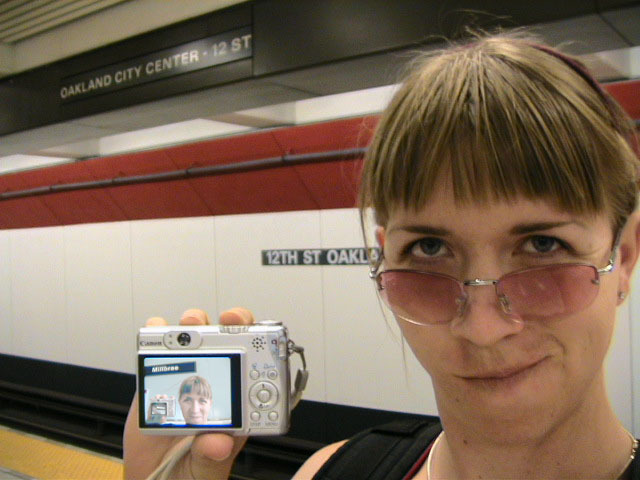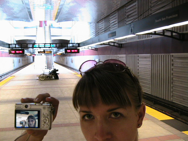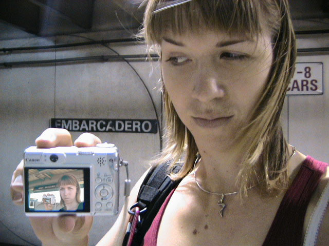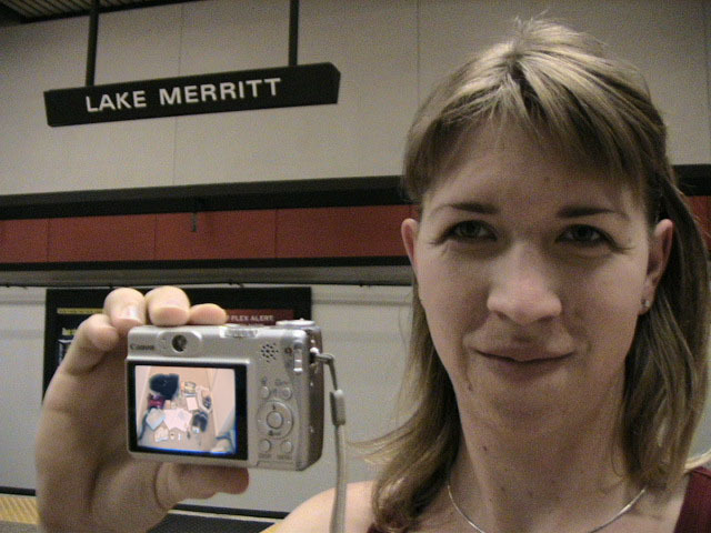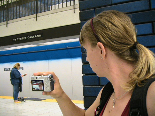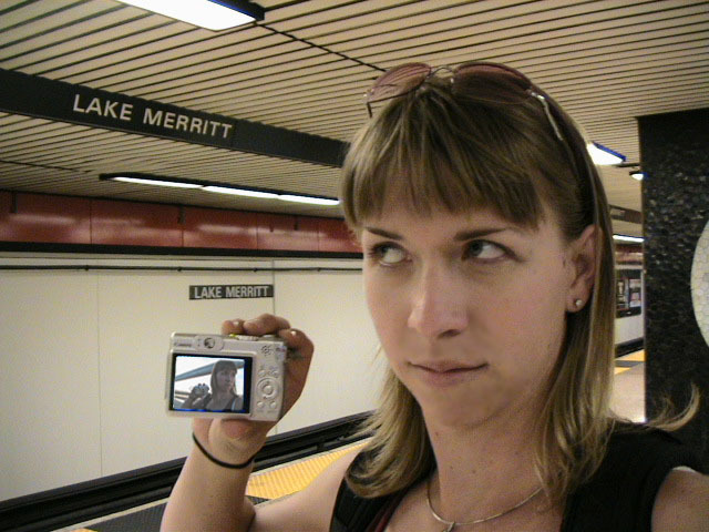 Yes but how do you take a single picture showing all of the above information? Aaaahhhh, yes. The how. Simple. Daisy-chain through time and space using two digital cameras with interchangeable memory cards simultaneously. I begin my journey at Lake Merritt. I take a picture of myself with one of the Lake Merritt station signs. I hop on the next train going South and disembark at Fruitvale. Now, using one of the cameras to display the picture of myself at the Lake Merritt station, I again take a self-portrait, making sure the camera's display is in the current frame. As this second picture displays me at both the Fruitvale station and at the Lake Merritt station, I have effectively taken one picture of myself in both places at the same time. For the third station picture (Coliseum), I had to take the memory card out of the camera that had taken the second picture and place it in the camera for display. Of course, this meant taking the memory card out of the display camera and providing it to the taking camera so a picture could actually be recorded. So, the third picture not only spans space and time by displaying all three places simultaneously, but also makes the chain itself span recording devices and become an entity of itself jumping from card to card..... And so on and so on until the final picture - taken upon my return to Lake Merritt at the end of the day - displays my self portrait at all BART stations simultaneously. Now, given an astronomical resolution of said picture, one could zoom in through all previous locations until arriving at the original picture, then all the way back out again. Since such a picture would take an awfully long time to download and couldn't be constantly displayed as my profile picture in anything but an abbreviated form, and thereby y'all wouldn't get the liberty of trying it yourselves, I decided to also create and provide this film: