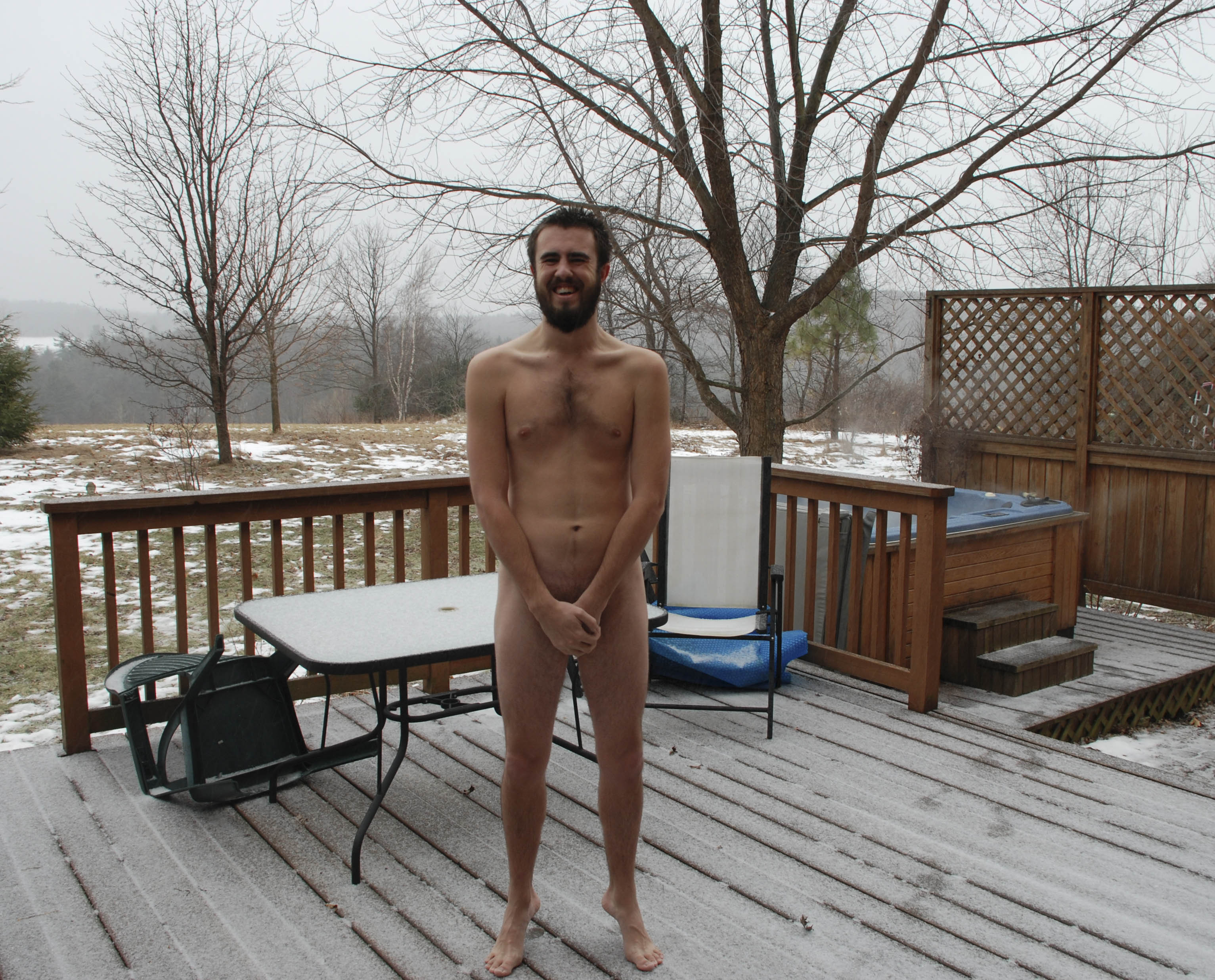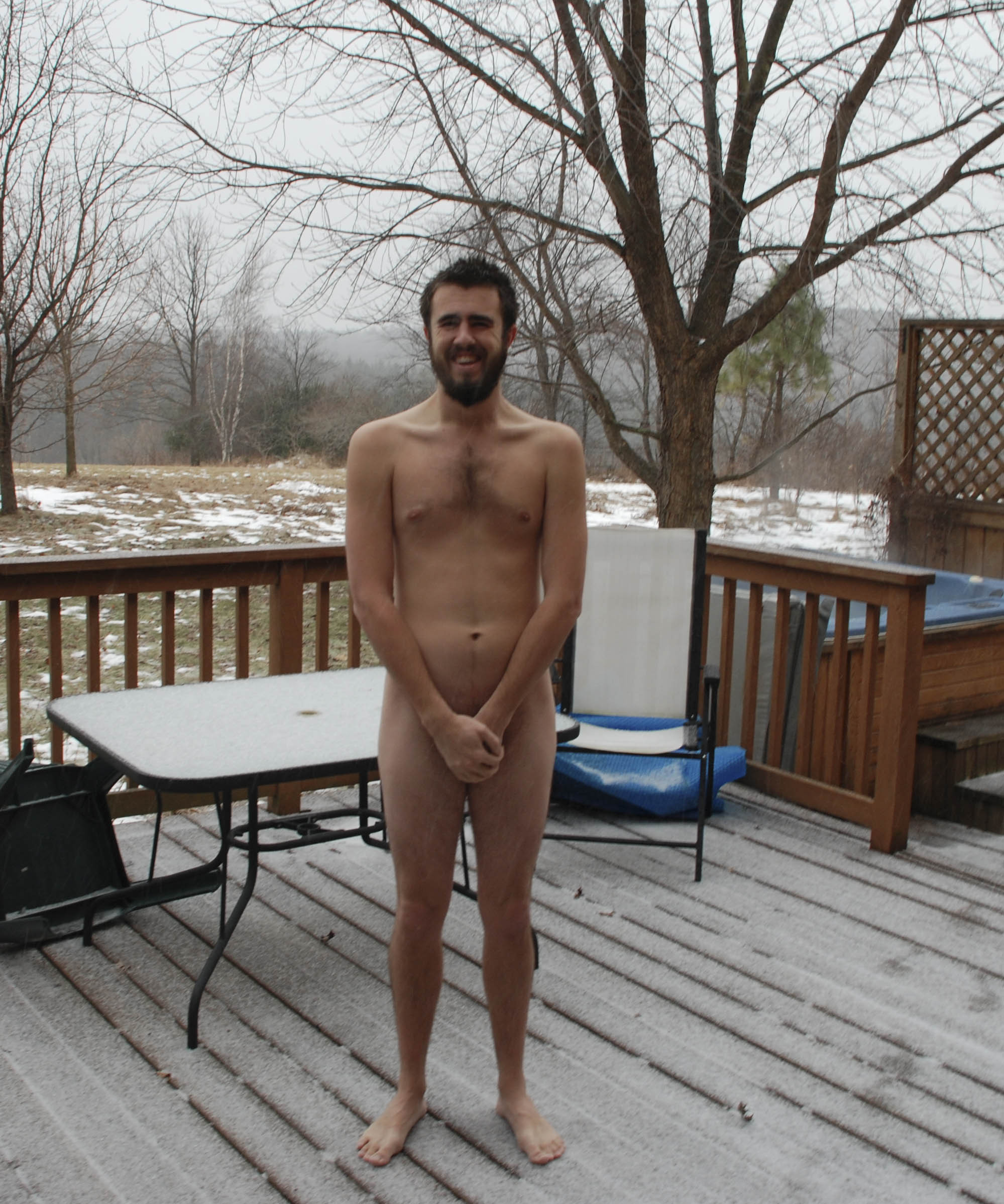 You can see that by the time I was done, I couldn't stand flat-footed any more. The cold was uncomfortable that I had to stand on my tip-toes in an attempt to escape it. About .02 seconds after this shot I was neck deep in the hot tub again.