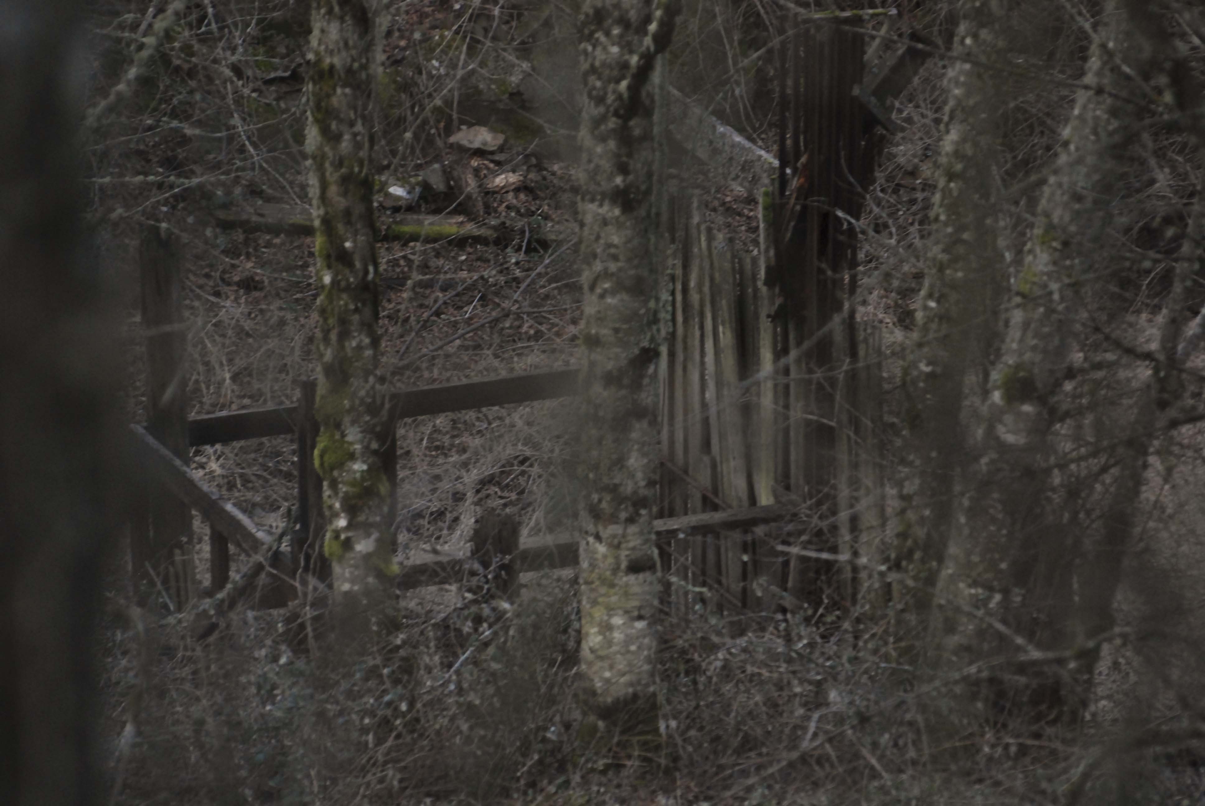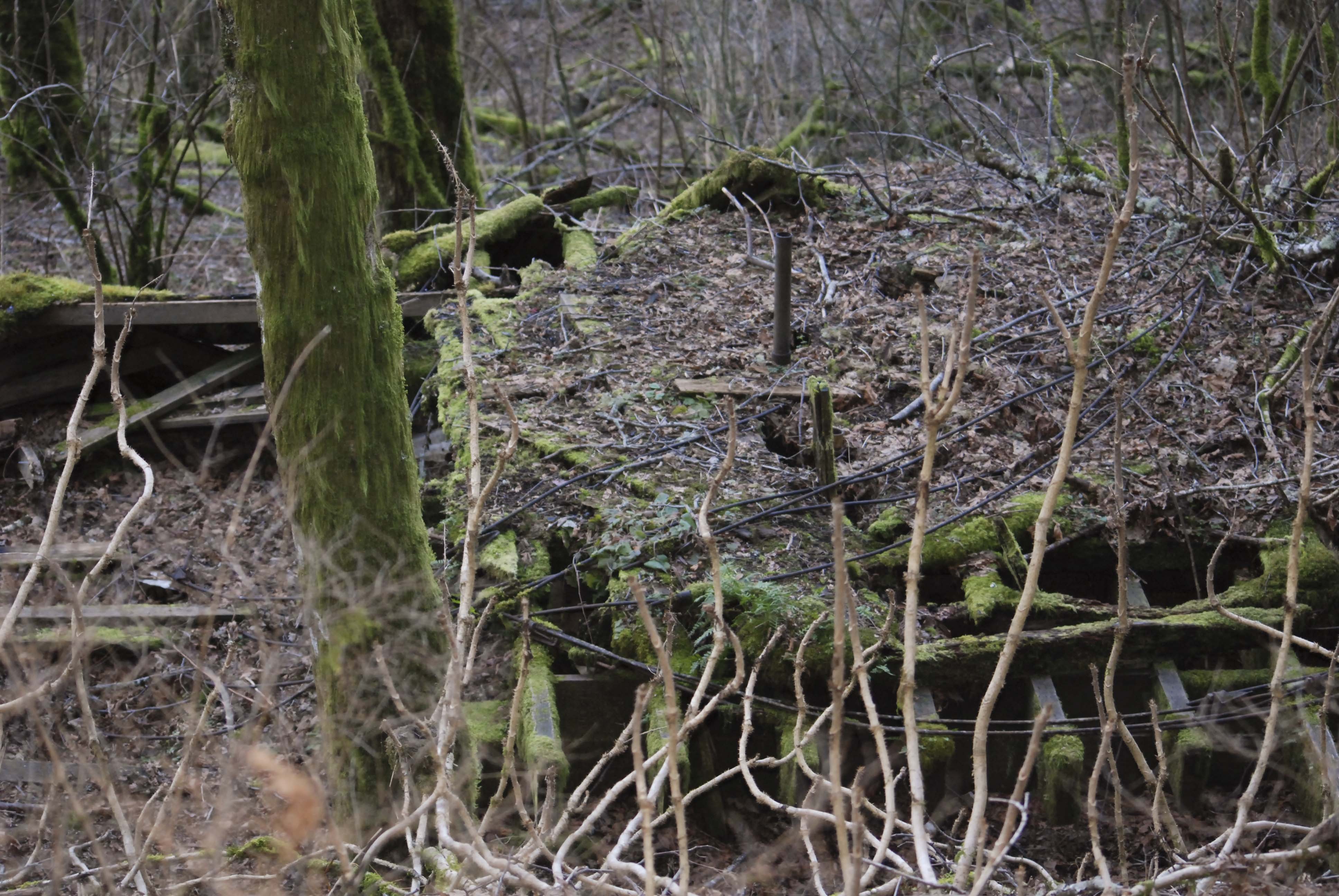 This was one support of a bridge that used to cross the road. I think that it was part of a path that went up to the collapsed building.