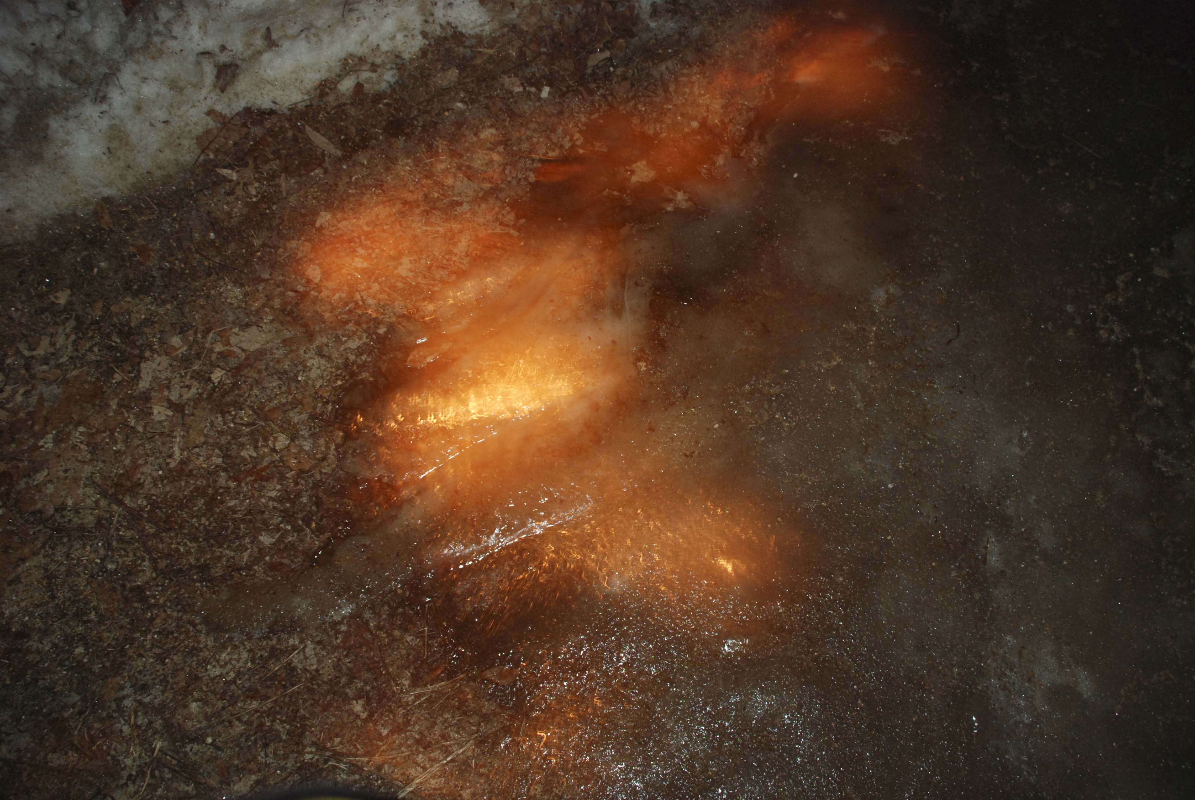Ice flow at the end of a driveway, with my flashlight beam for the glowy effect