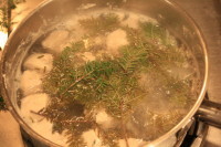 Ya. Tsuga this! Branch of said tree and pot of boiling chicken and other stuff with Canadian Hemlock in it.