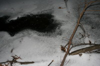 I can hear the brook really close now. I sort of step/fall down to the edge of it, i think. It feels to my foot and stick, and sounds like ice. It seems to be solid all the way across. There should be running water in the middle. Am i really there yet?