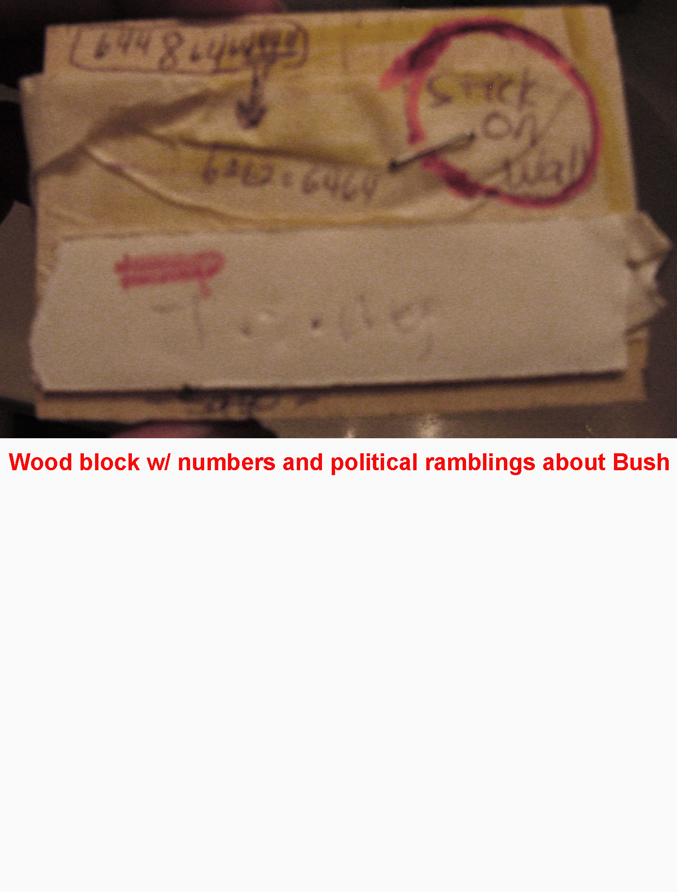 3. A small wood block with random calculations and ramblings of George Bush on the back.