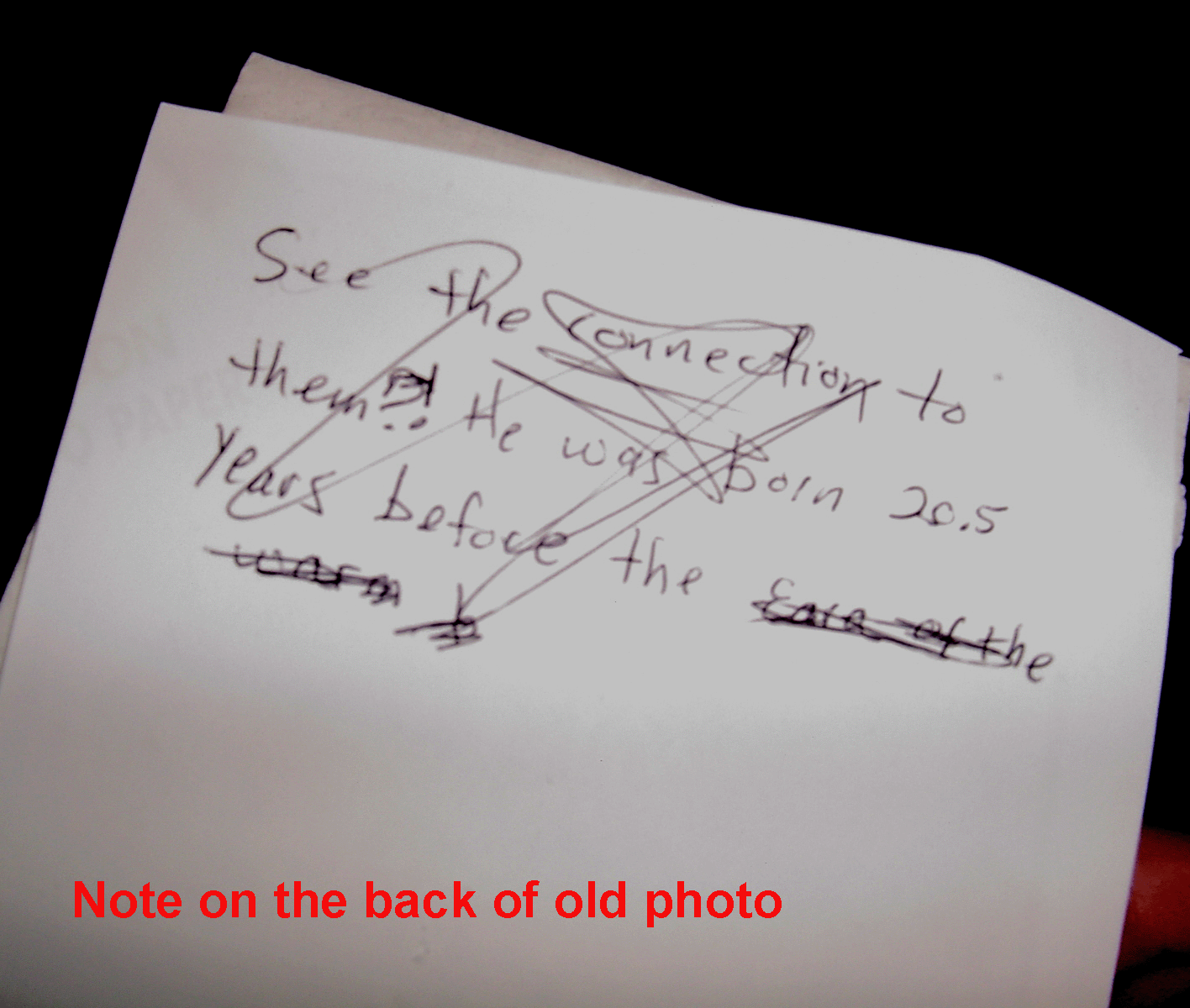 11. An old touched up photo of my grandfather with some paranoid writings on the back that are half scribbled out. This is stapled to the random papers from #4.