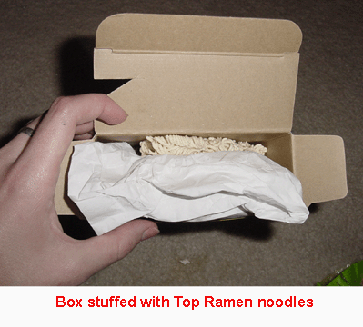 All this is wrapped in white tissue paper and put in an box that has electrical tape and more notes on it. I put this package in the box and packed it with Top Ramen-like noodles, smashed up. My cat, Poon, liked this part and started muching on the noodles... like she needs more carbs.