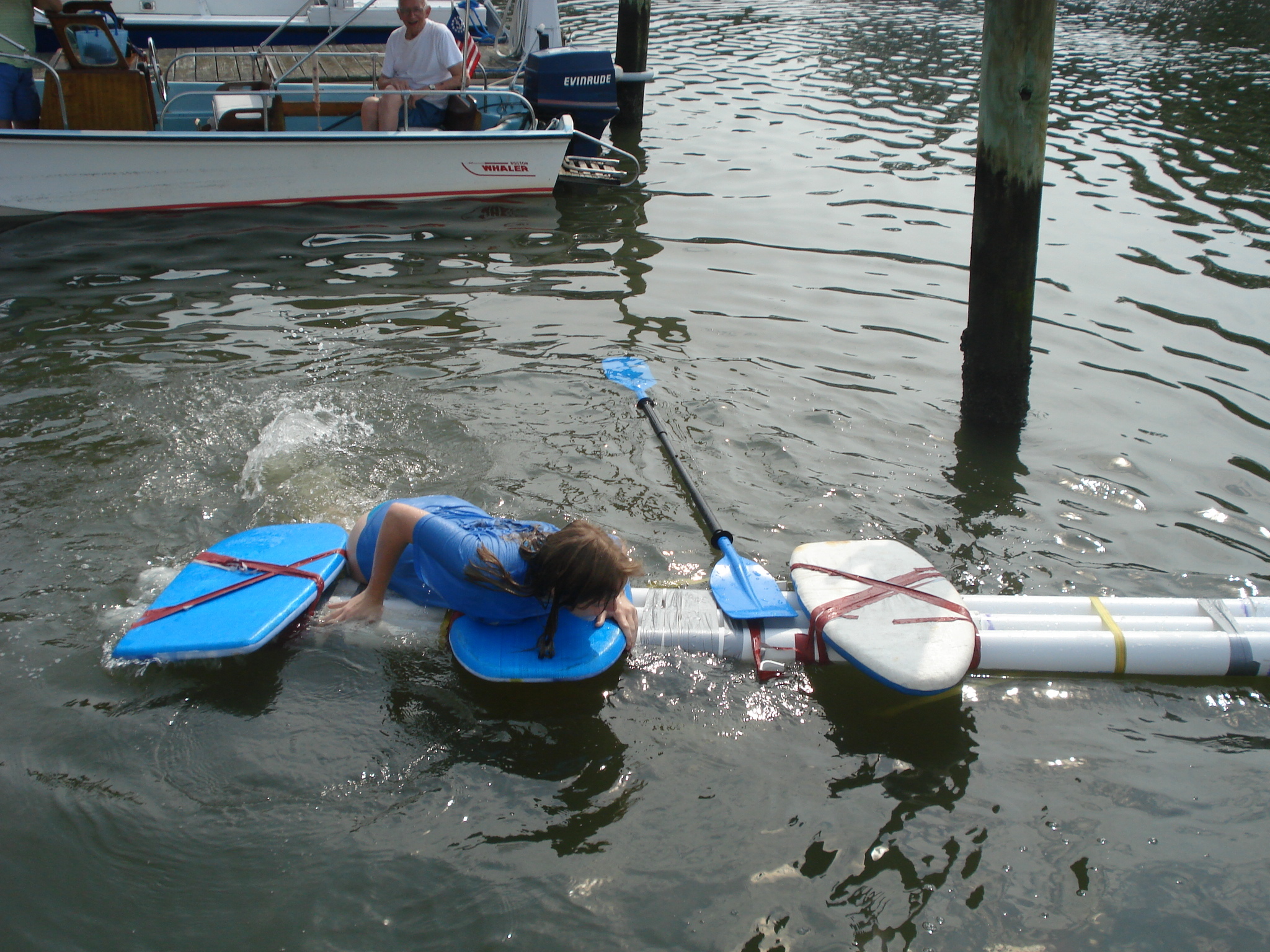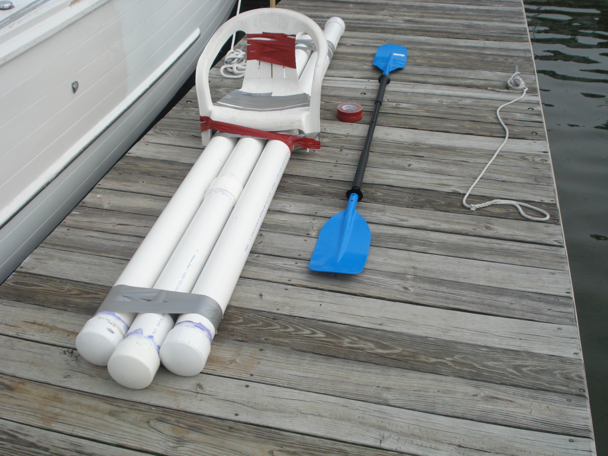 My step-grandfather 'stepped' in again to help me with this task. In the end, we pretty much used the same materials from the tower. In fact we glued the three tripod pieces together to create one. This and two other thick pipes were used, along with duct tape (and later on other things) to create the vessel. After that, a chair was sawed down to be placed on the vessel. It was decided that it would all be duct taped together at the dock when we finally got there.