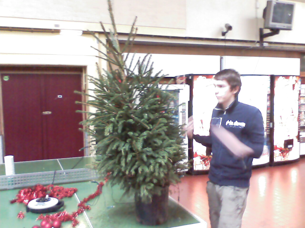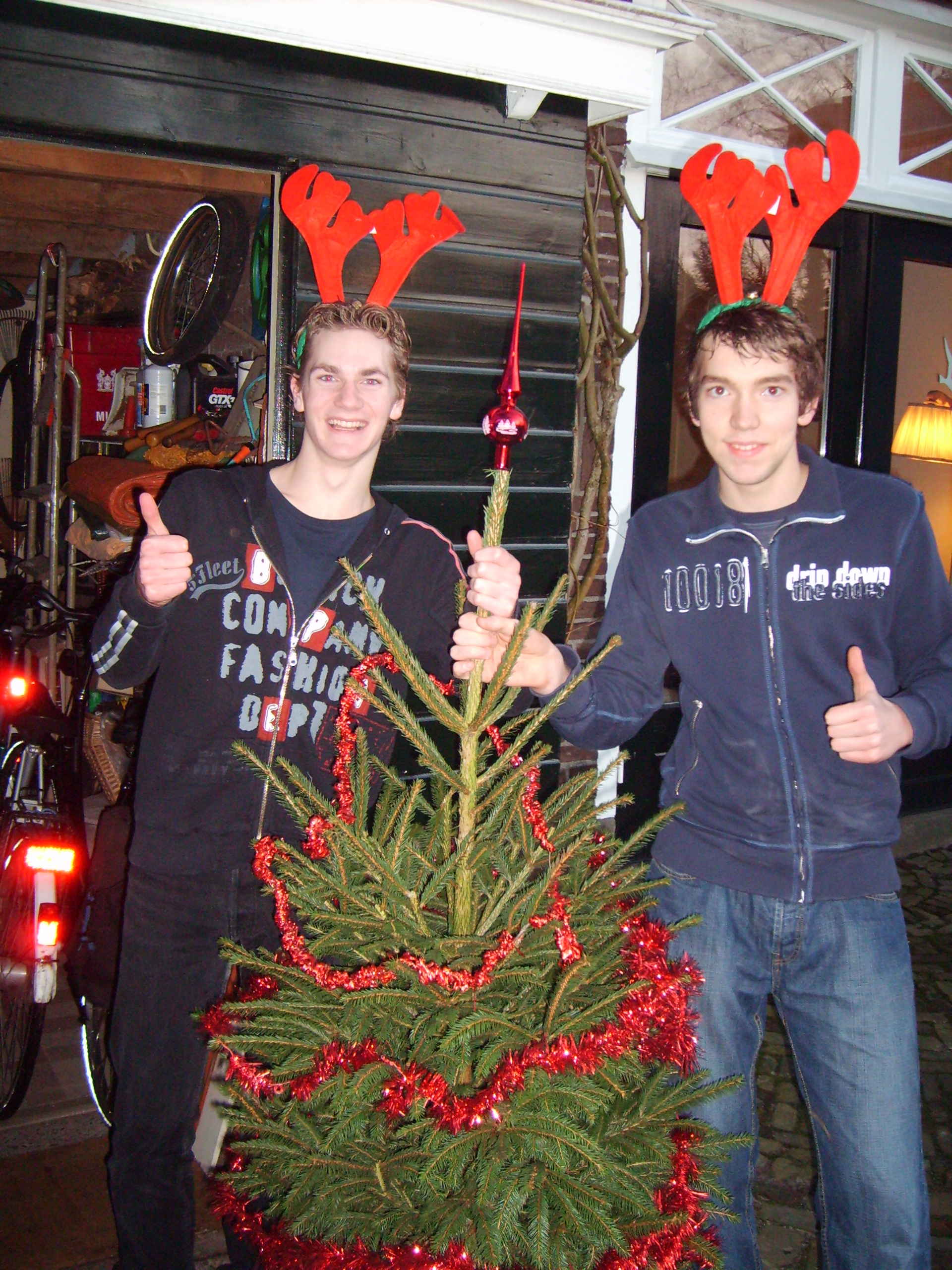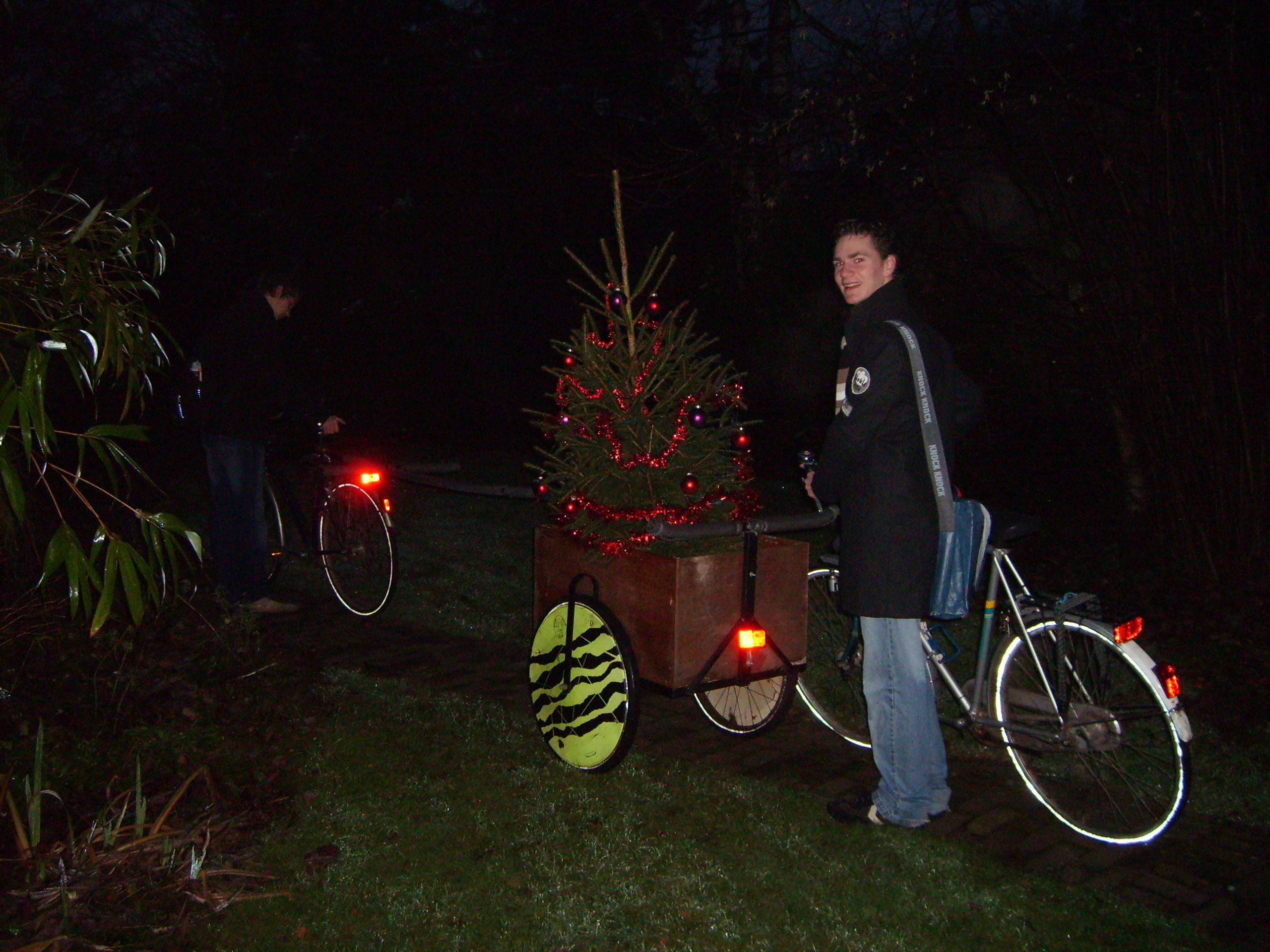 At first we were planning to place a normal house-plant in our school hall, but we that turned out to be too expensive (we deidn't really want to spend a lot of money on this task. It wasn't until the chrismas season started when we had a much better idea. Since our school had no chrismas trees or decoration whatsoever, we decided to bring our very own potted tree to school (I know it's not a plant but hey, who ever heard of christmas plants?). We had the idea on the tuesday before the holidays, we were still at school so we went straight to the janitors and teamleaders (We didn't really feel like showing up with a tree and being sent back because of a possible fire hazard or something). They weren't really all that exciting because they weren't sure wether it's was legal or not, but we got our permission and so we went shopping. We went to the local shopping mall by bike to purchase a tree (yeah, not a good idea). We got one for roughly 10$ and bought some decoration as well. Then came the hard part, we had to take the tree home on our bikes. We decided to balance it on the back of one of our bikes and just walk it home.
