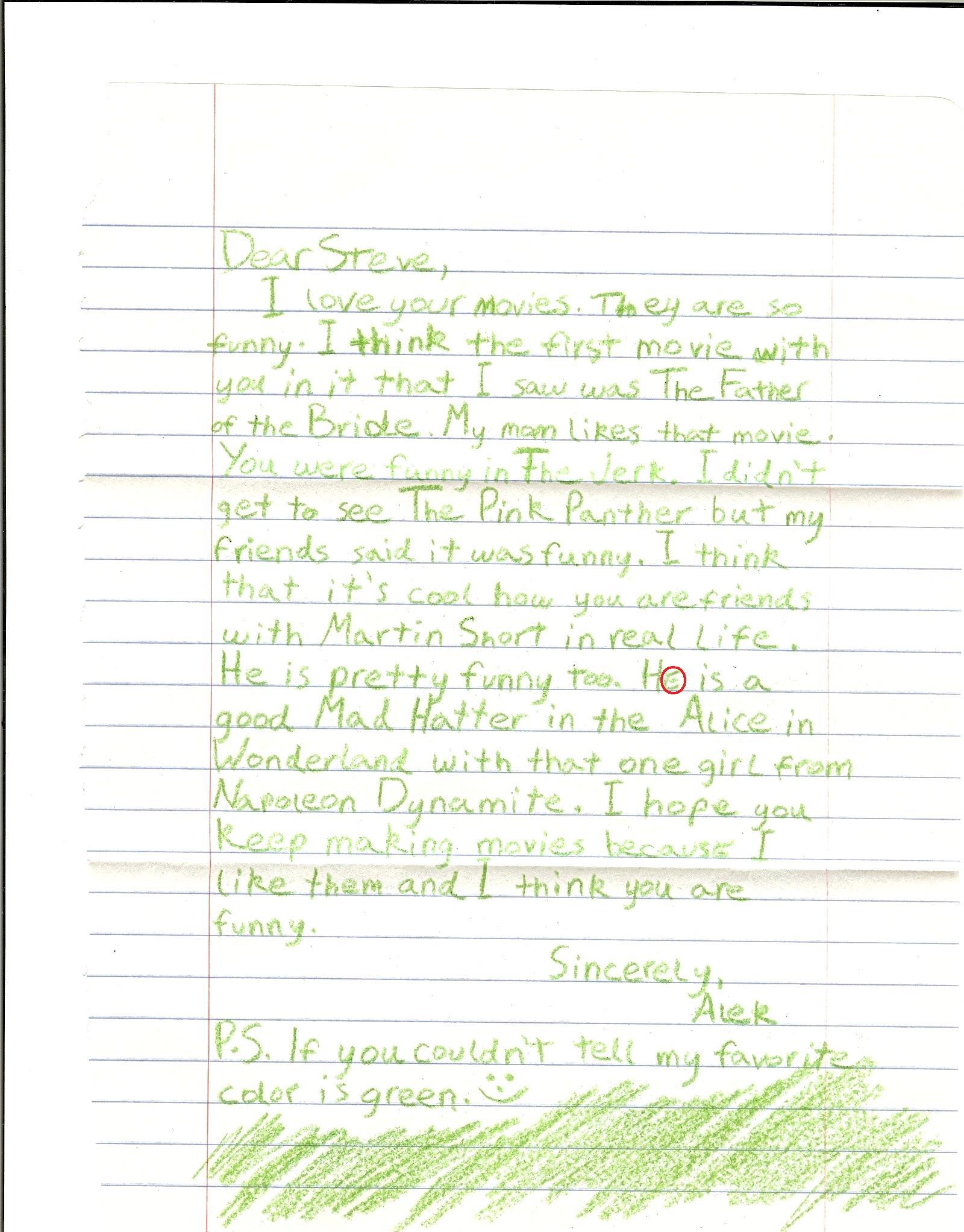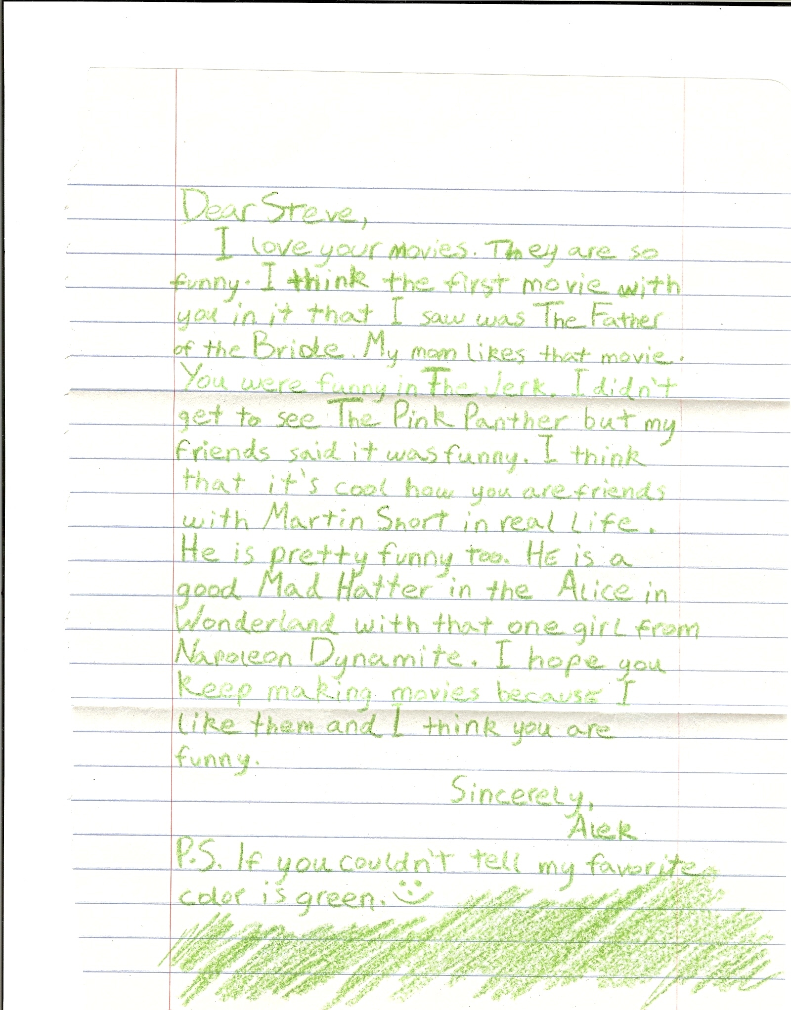 I wrote it with a green colored pencil on a piece of my sister's notebook paper. I figured it would be more believable if it looked like a young kid wrote it so i tried to actually use lower-case letters like we were taught in school (I write in all-caps just with the letters that are supposed to be capital bigger than the rest). It was hard. I don't like lower-case letters. Anyway, it's done and now I need to find an envelope and stamp and it'll be on its way to Steve Martin.