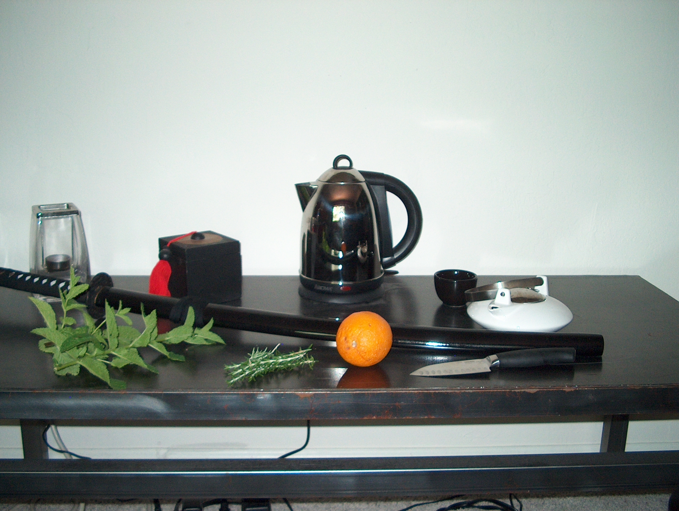 So I found all of the ingredients. The mint was in my yard by an old greenhouse. I don't really know how it got there because we never planted it. The rosemary was in my neighbour's yard; yea, I hopped the fence and took it without asking. He's not going to miss it. The orange however was a little difficult to find. I had to walk two streets over and eventually found an orange bush (tree?) growing in front of a house, so I just walked up and picked an orange. Pretty good example of suburban harvesting, if I say so myself. I then cut up all the ingredients and brewed them in my tea set. The hardest part was making orange zest, as all I had was a santoku knife--a rather big blade for such fine cuts. The tea itself is quite good; I thought the rosemary might give it a funky flavor, but it didn't. Well, I feel a little better, but I think it may have more to do with the vitamin C in the orange I felt obligated to eat than the tea.