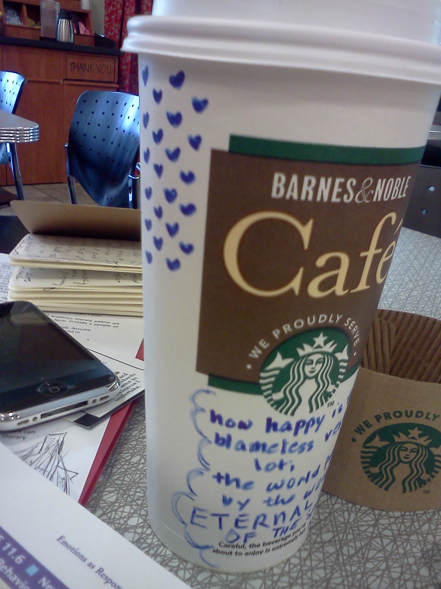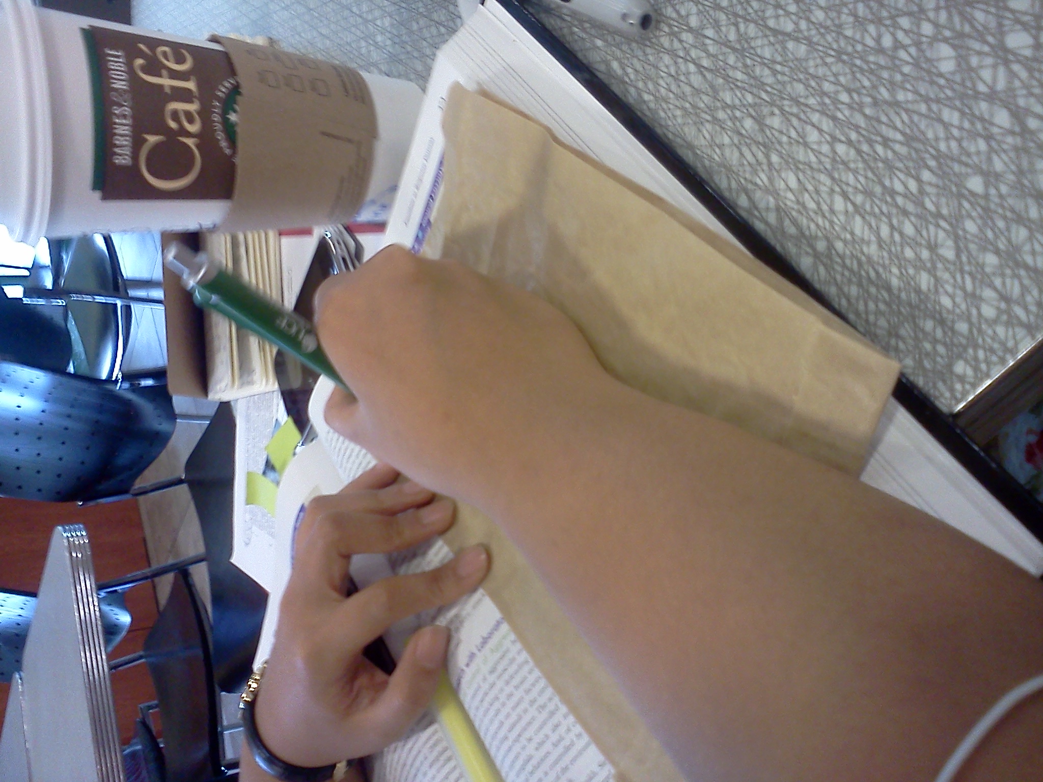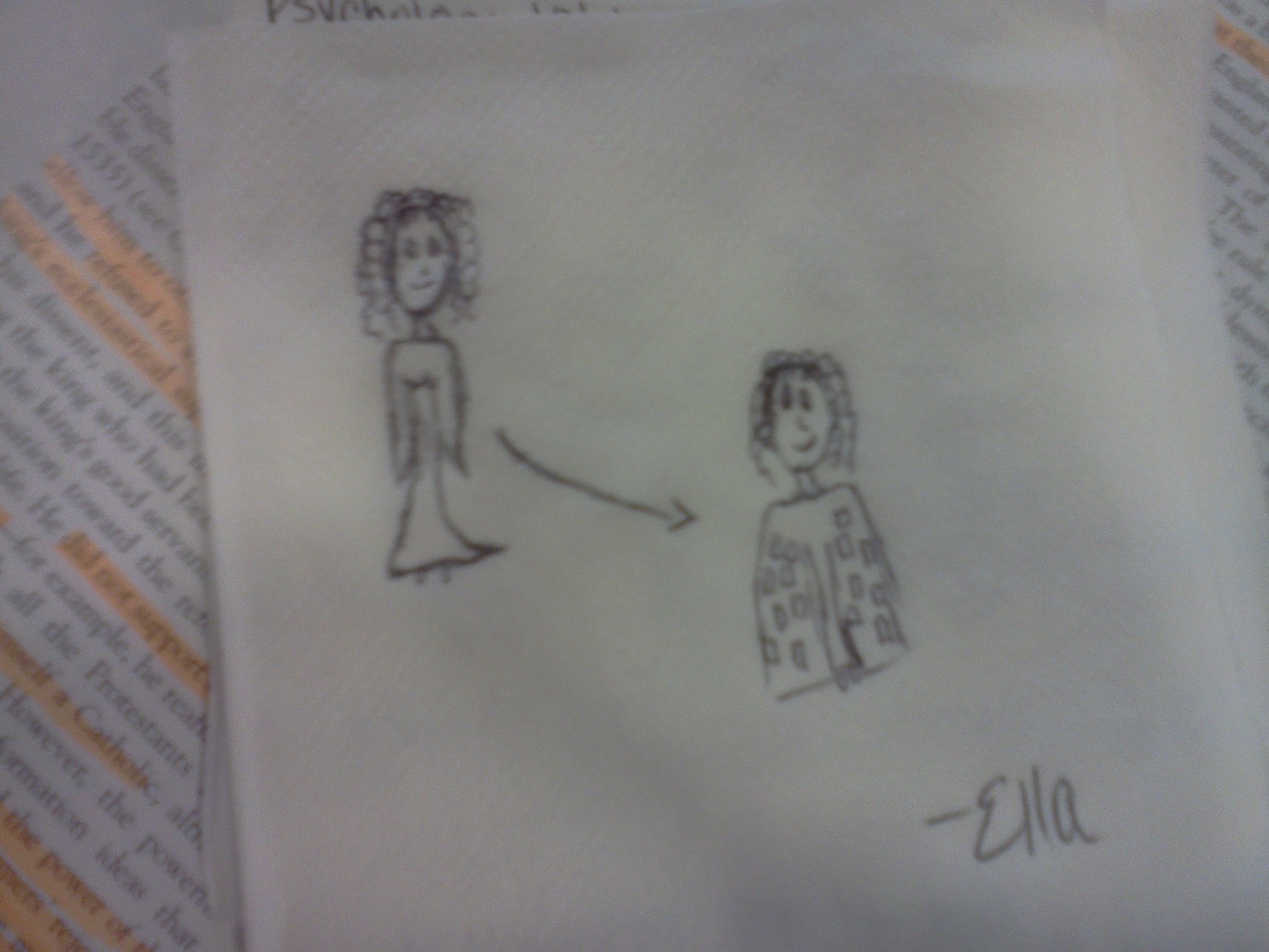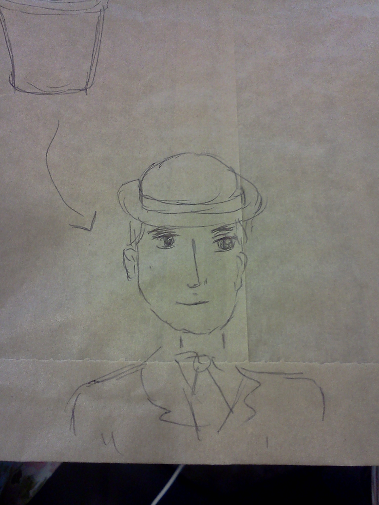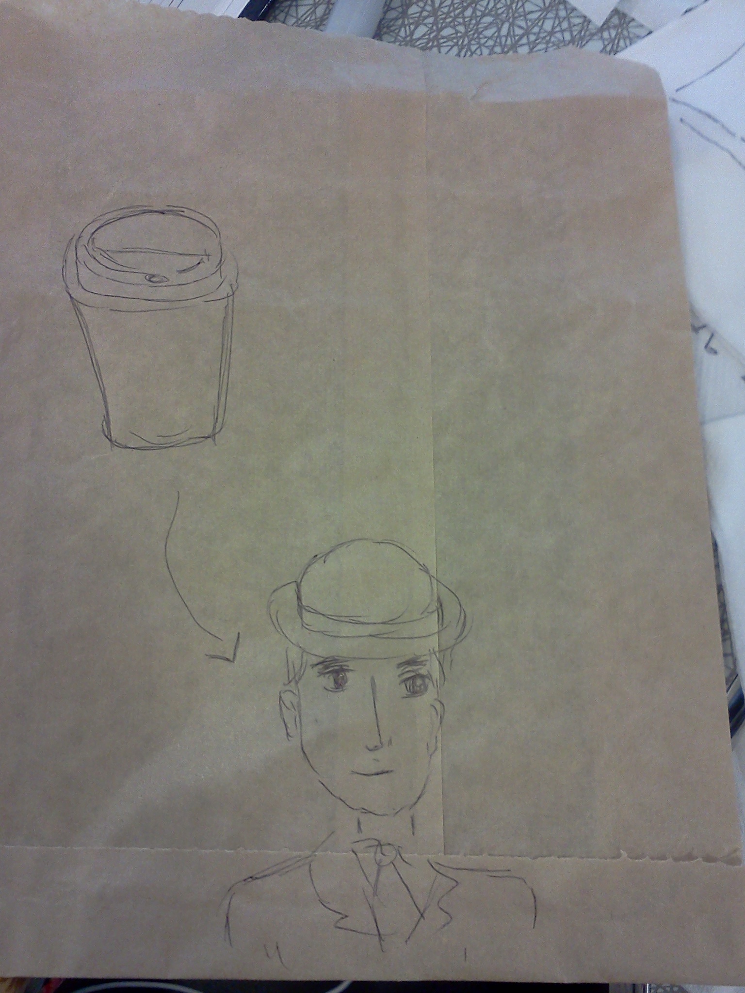 Ms. Annie was reluctant at first, and moved back to her studies. It wasn't long, however, before she reached for her pen, and for the paper bag her lunch had come in (it now resided in her stomach), and she began to draw. She first drew her cup of coffee, perhaps seeking some kind of inspiration. Finally, she began to draw a man, starting with his hat. Ms. Ella watched with curiosity; where would this adventure take them?