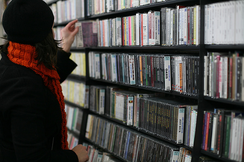 Browsing the hand-picked rock selection at Joe's Garage in Kyoto.