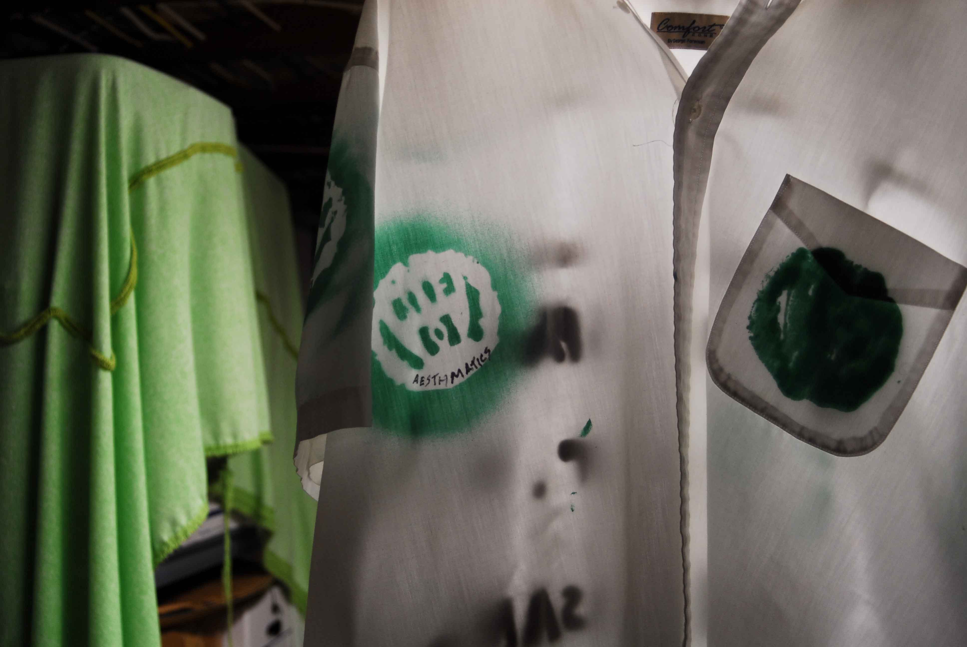 Execution day, we entered the thrift store, humbly, on our mission. Well, missions. Besides finding a shirt, we had also resolved not to buy several unnecessary suits, especially purple ones. We were successful on both counts. We hunted and found our weapon of choice - a simple button down shirt from the 3 dollar rack, priced at six dollars because, we were told, of the brand on the label. We grabbed some interior spray paint from a nearby hardware store, went back to the Bad Factory and began to plot our stencils.