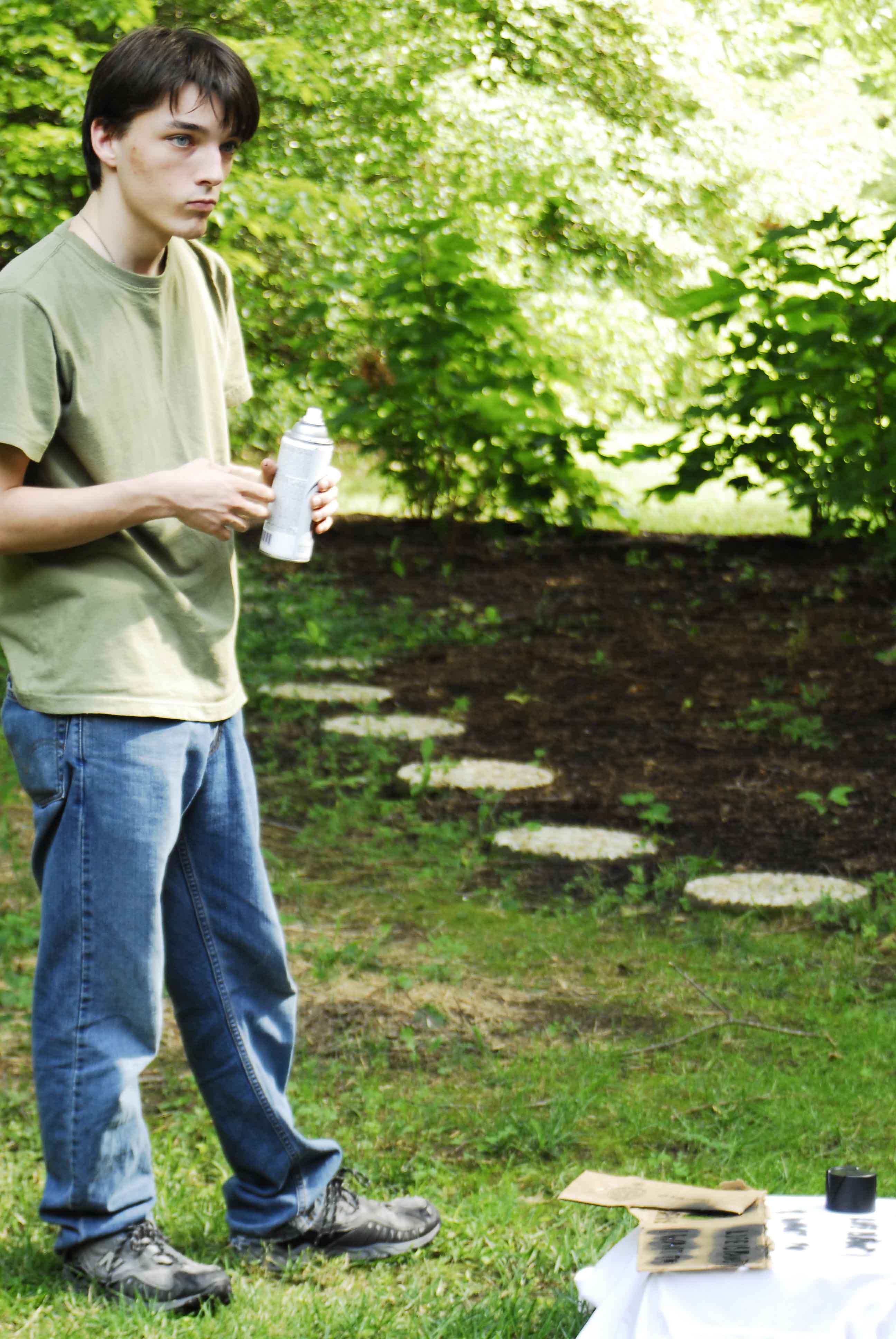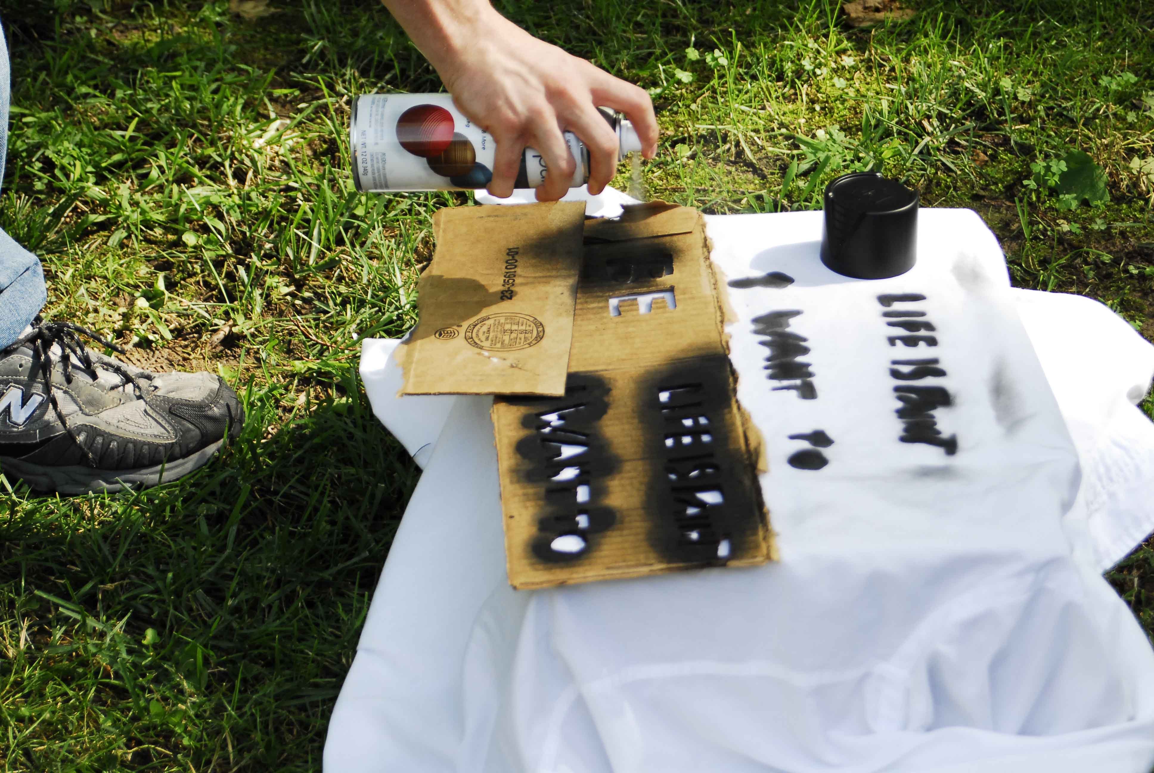 After two grueling, cardboard-cutting hours, we set out to paint in the circulating air. The sky clear, and the weather warm, we placed the stencil atop the shirt and sprayed the blackness upon it. For my project, that was that. It was insisted that I wait for the final touch, an intricate stencil of the Aesthmetics' seal, which, knowing Mal, will be finished just before this round [era] ends. [you bastard]