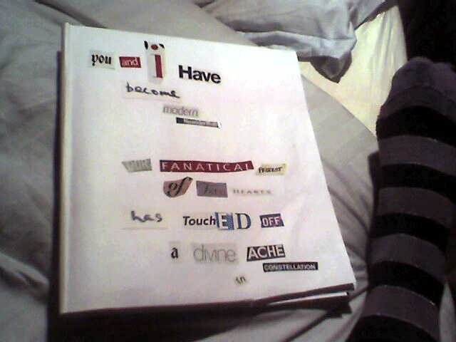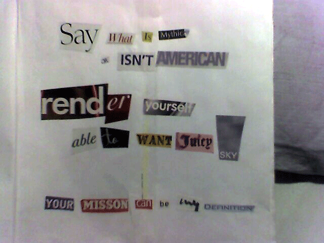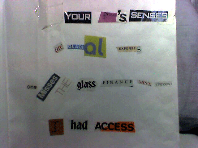 Several hours later, gluestick in hand, wineglass replentished, I sneaked out of the house to work on this project in the driveway, since it had fewer cats and more space. Bicycle bats soon vanished into the night in a soft breeze, clearly collaborating with cat. I perservered. Categories were no longer practical. I counted. I sometimes used the most airborn words first. I somehow could not shake the rhythm and alliteration. Which is odd, since I instinctively distrust poetry.