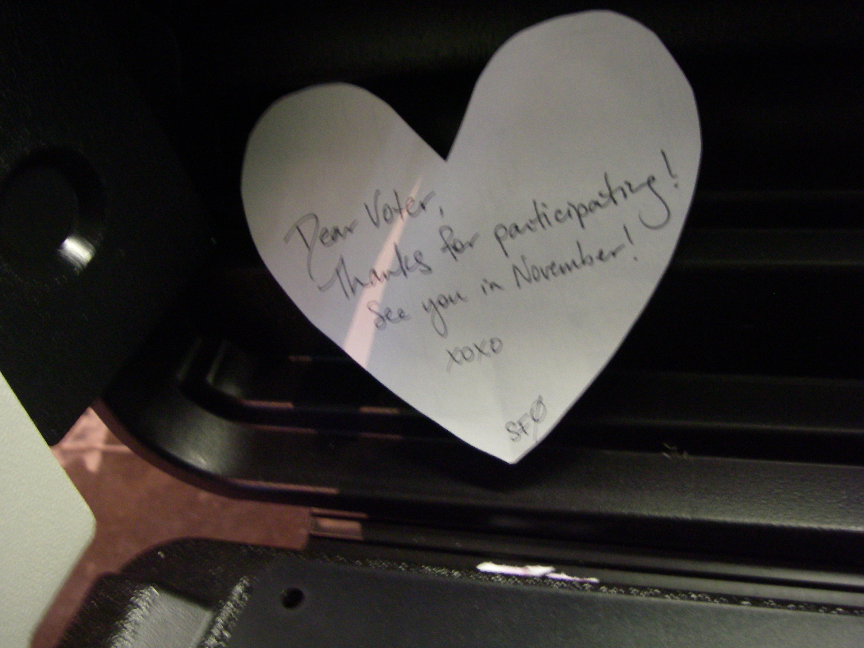 I headed over to this one with my notes prepared and ready to be affixed. I was wearing a lovely bowler-type hat in a charming purple color today so I carried my pre-taped notes in the upside-down hat in an effort to be surreptitious. While I signed in and got my ballot no one seemed to notice my hat full of goodies that I was carrying with me. I took the ballot into the voting booth, a sort of make-shift plastic lectern with sides. I was in the very last booth which I didn't think would bode well for anyone else seeing it, but all the other booths were in use. I couldn't very well wait when there was an open one and people waiting behind me. So I went in and taped my note to the inside of the booth. I had made two heart shaped notes (it being close to valentine's day this seemed appropriate). One said,