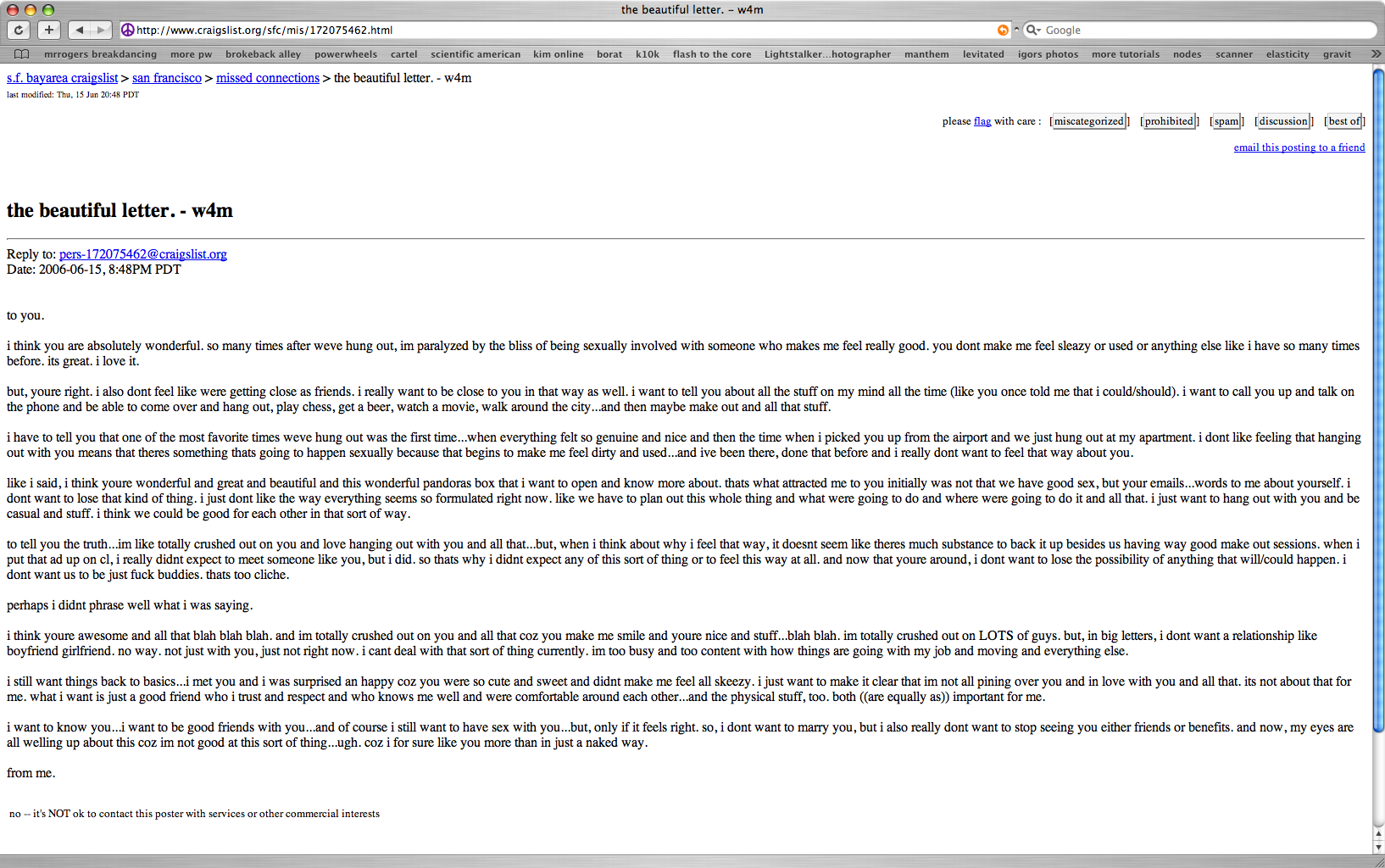 to tell you the truth...im like totally crushed out on you and love hanging out with you and all that...but, when i think about why i feel that way, it doesnt seem like theres much substance to back it up besides us having way good make out sessions. when i put that ad up on cl, i really didnt expect to meet someone like you, but i did. so thats why i didnt expect any of this sort of thing or to feel this way at all. and now that youre around, i dont want to lose the possibility of anything that will/could happen. i dont want us to be just fuck buddies. thats too cliche.