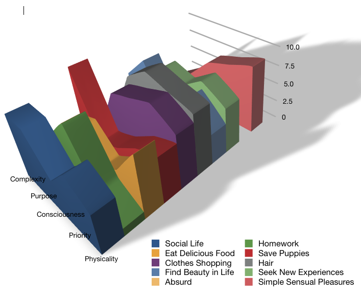 10 desires were rated out of 10 for the following: complexity (how complex the desire is), purpose (how useful is it to me? eg. food is very useful), consciousness (of the desire), priority (that I place on it), and physicality (versus mentality).