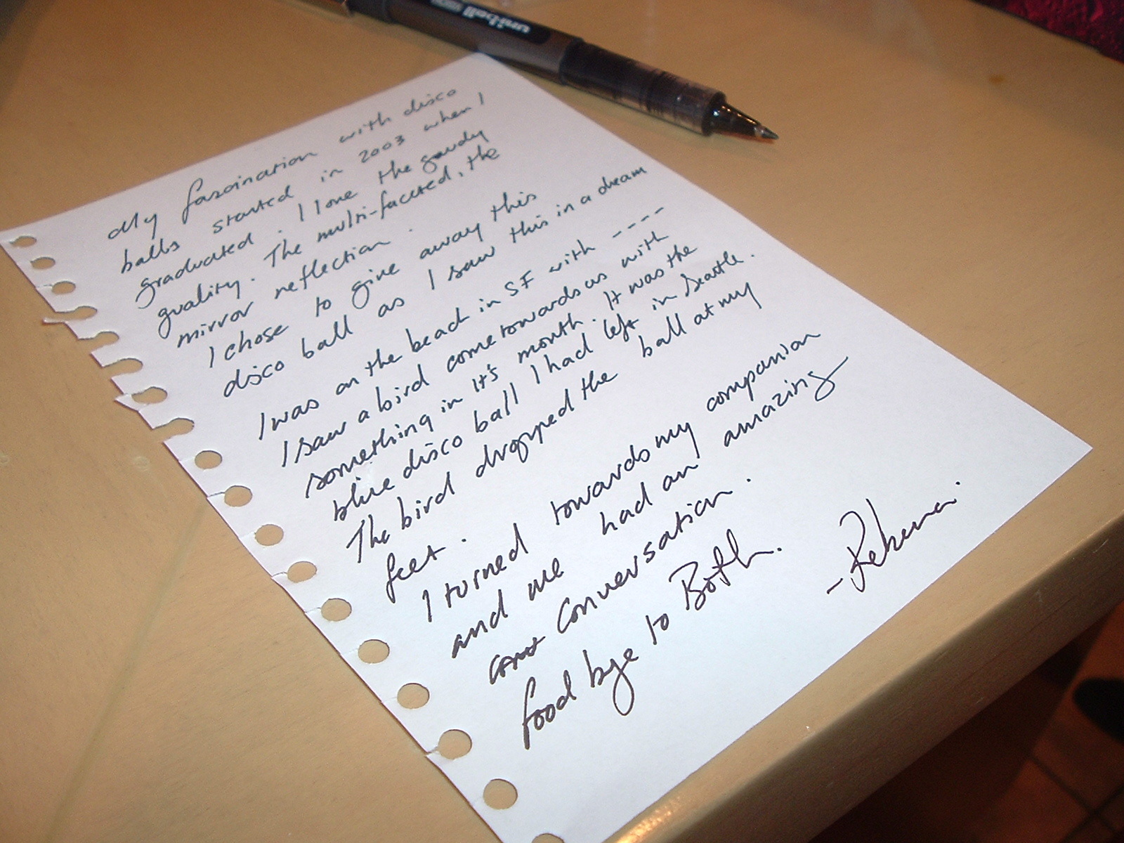 I told my friend Jamie to bring the disco ball with her to the house in Seattle I was staying at. My plan was to leave the disco ball somewhere, attaching notes to it saying farewell to some of the things that happened to me in 2007 that I would rather move on from. I asked the group of friends that I was hanging out with, whether they were up for contributing their own leavings to the ball. Being of good quality friends, they were totally up for it.
