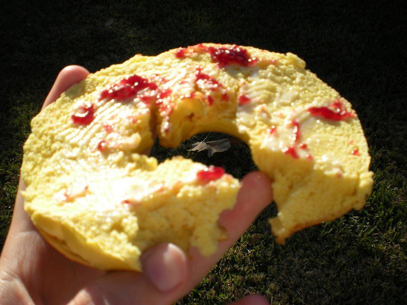 Also playing around with focus features on my camera, I was able to both focus close up on the bagel, and on a leaf on the lawn seen through the center.