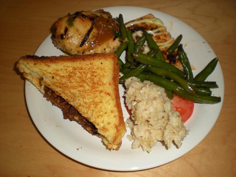 This was a real treat. The night before they had served a barbecue beef dish; leftover bbq was served in grilled cheese sandwiches, and it was sinfully good. Also pictured: apricot glazed grilled chicken breast, sesame grilled string beans in soy sauce, garlic rice pilaf, and baked swordfish with wasabi mayonnaise.