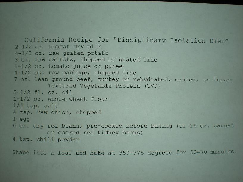 That quote you just read was from their latest draft. I got in touch with them and decided that for the sake of scholarship and science he would prepare as many official state penitentiary recipes as were available for this meal, and I would eat them. ......Moreover, while he was only trying them to comment on their flavor, I was willing to take on the real challenge -- eating ONLY nutraloaf.