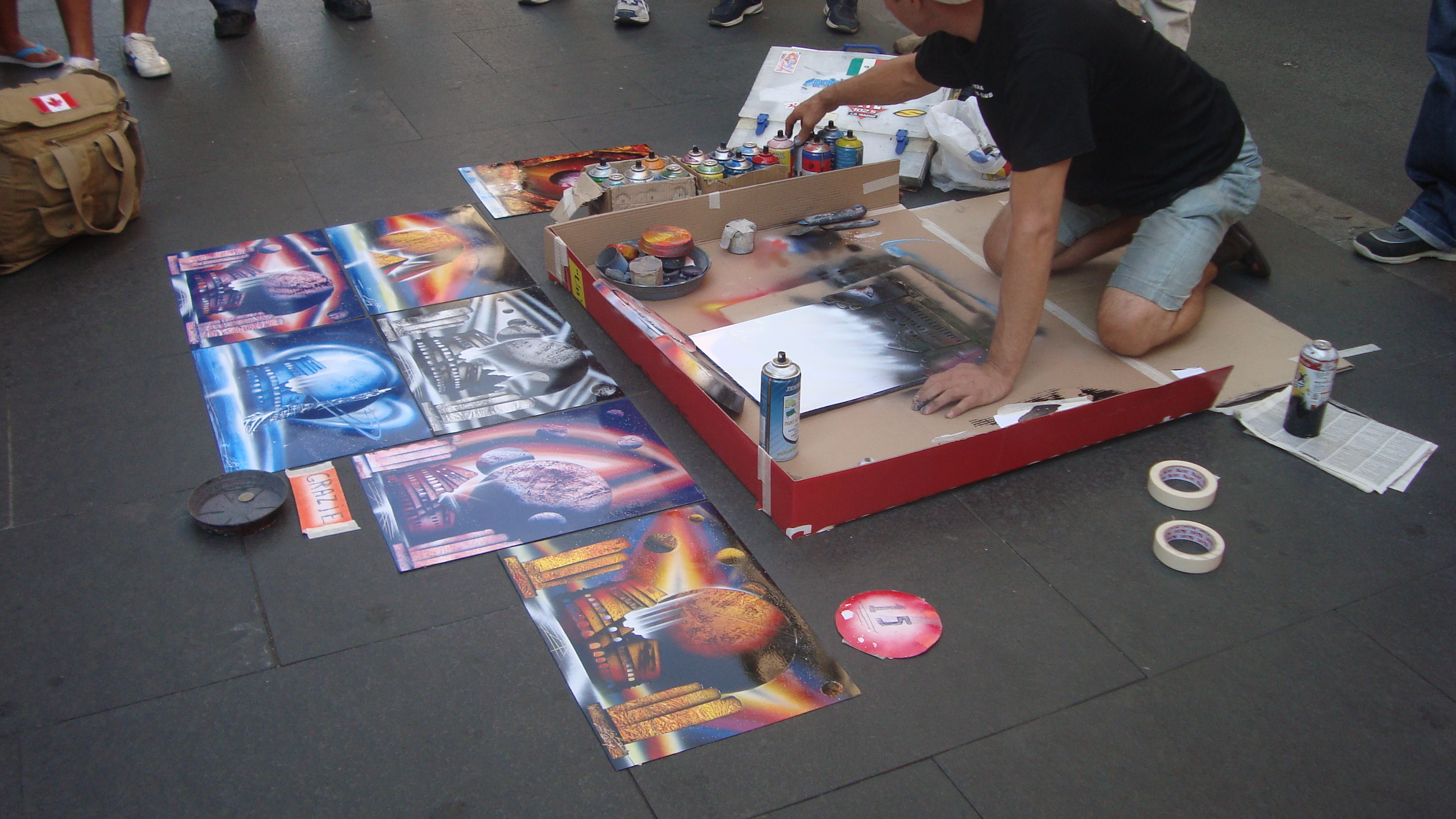 MOST BRILLIANT GUY EVER!!! He used stencils to create full fleged paintings of Rome with the planets as a backdrop. All he had was a stencil of the city, newspaper, a knife, some cd's and his spraypaint. He worked fast too. By the time I took this there was a huge crowd forming.