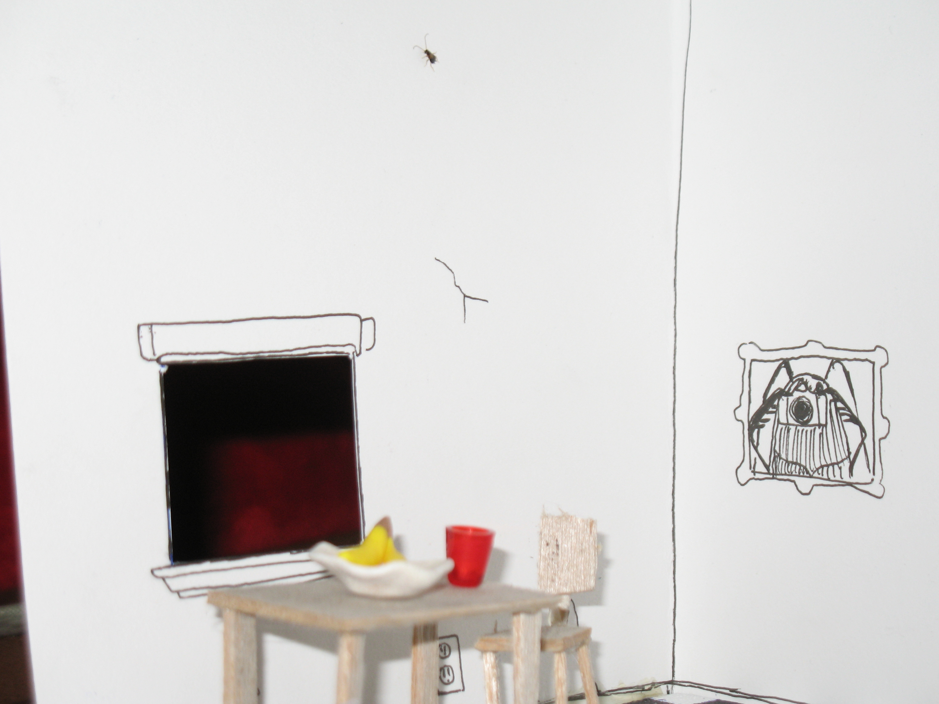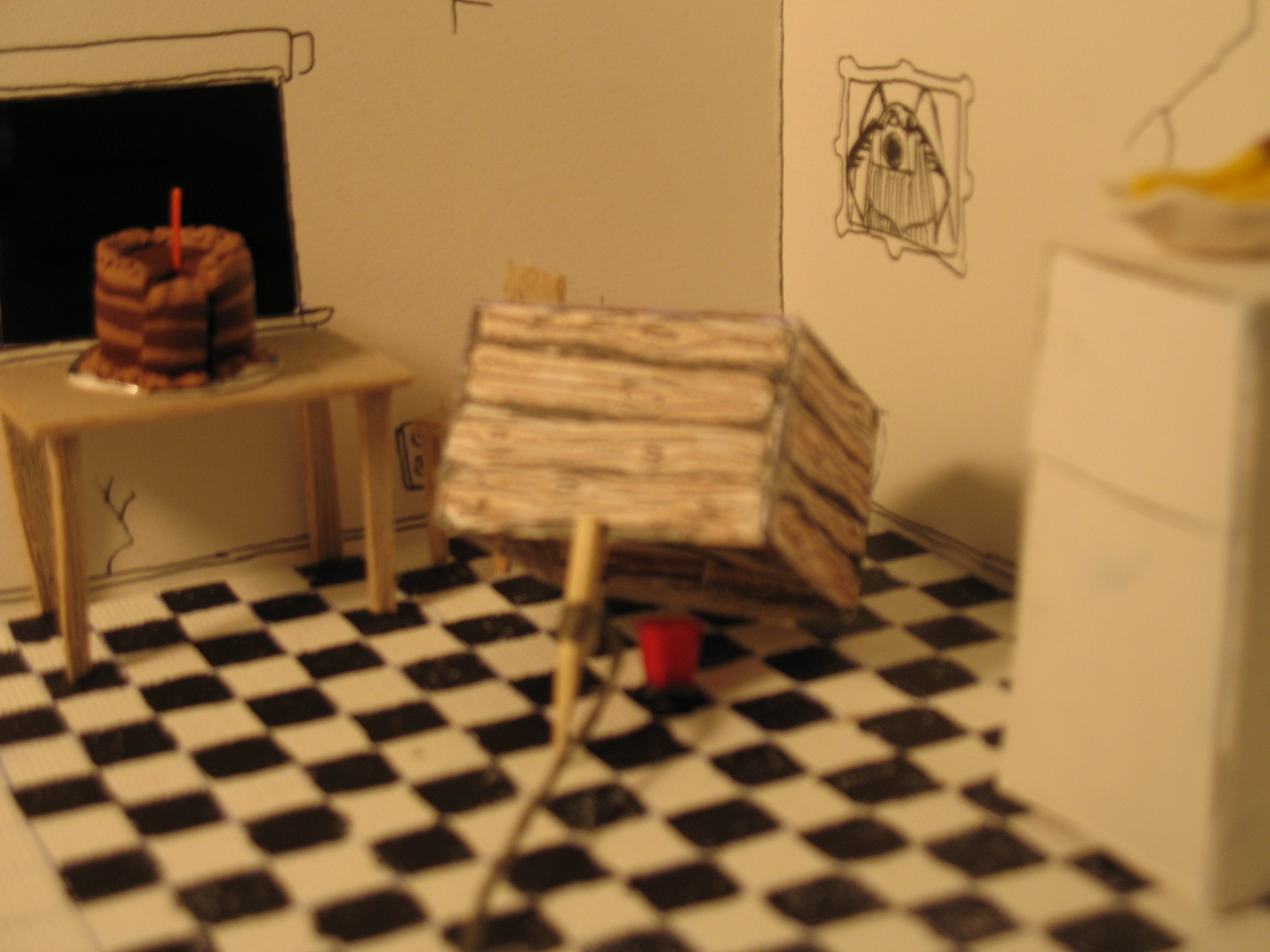 Instead of using my own kitchen, baking a delicious chocolate cake, and setting it on the floor I decided to take an alternative approach. I would build a kitchen and construct a chocolate cake to proper cockroach scale. main_img297470212.jpg As for the fishing, I would use the ole "box propped up by a stick tied to a string" bit with the perfect compliment to a chocolate cake, a mini-cockroach sized glass of milk. main_img295070203.jpg Please note the picture on the wall of a cockroach taking a picture of himself- this is to make our sneaky interlopers feel right at home, increasing our chances of a capture.