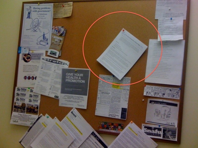 I don't know whether to be pleased/impressed, or disappointed. I work with a bunch of librarians, and, well, despite our welcoming demeanor--no, really, we love patrons and want to help! the stereotypes are outdated lies!--we can get a little snarky, amongst ourselves. Maybe my coworkers just don't look up? Because, surely, posting the Universal Declaration of Human Rights in the reference team's lunchroom is a statement of some kind, requiring some kind of response? (Librarians can also get a little defensive.) There's even a little doodled decoration on the corner of the page. And it's smack in the middle of some empty space, hardly hidden amongst a pile of other papers! And it's lopsided!
