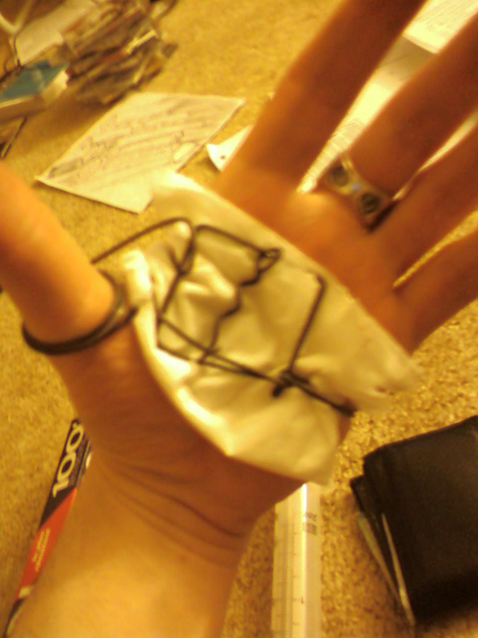 The wire wrapped around my hand, so I could still flex it and make a fist(ish) and around my thumb. In the picture, it looks pretty tightly wrapped around my thumb there, but in actuality it was nice and loose