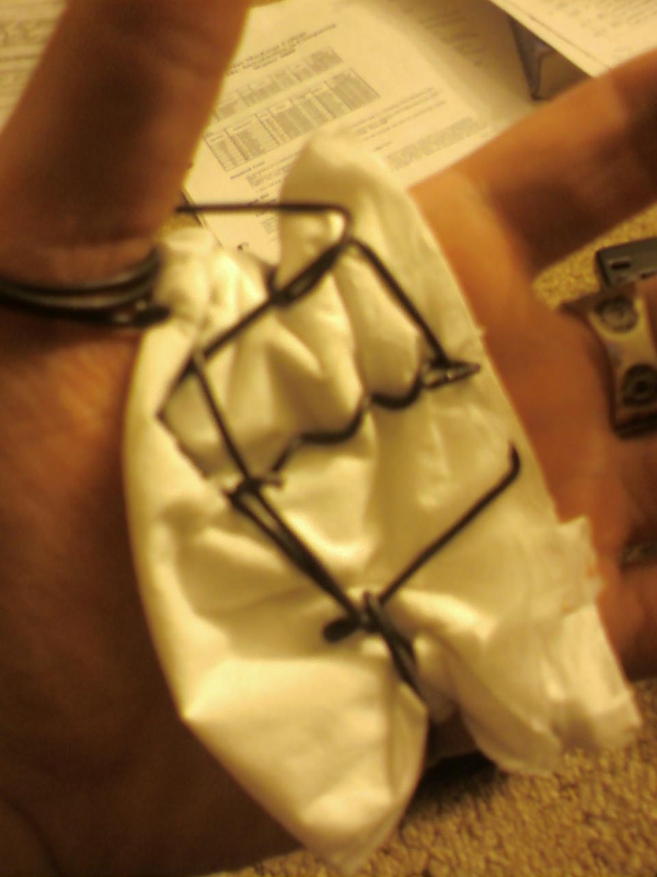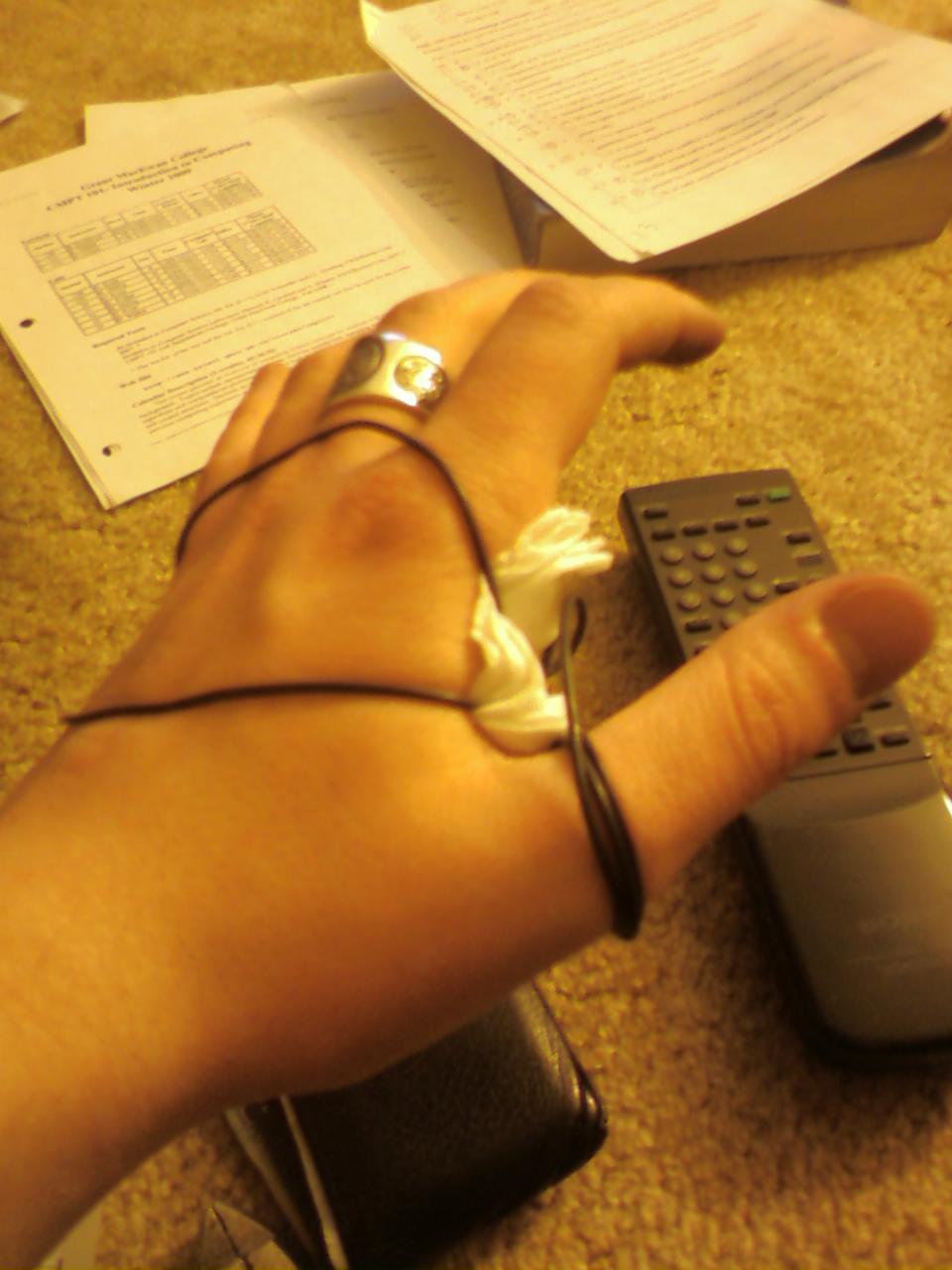Well, this little fix isn't on some everyday item per-say, it's a fix on me. I had cut myself fairly badly (not too deep, just long) right across the palm of my hand. Myself, being a starving university student, had not bandaids, no gauss, no wraps to cover the wound, but I did have some kleenex. Now the normal procedure when I cut myself its kleenex and tape, and voila instant bandaid. But in this case I had no tape whatsoever. What i did have though was some 16 and1/2 gauge steel wire (of course I have that and no tape, obvious right?) So after I got the bleeding down to a minimum, I grabbed my pliers and I began to work, forming myself a sort of pressure applying "cast" to fit over my hand. When all was said and done, and I had the device on, it worked great! I even slept with the thing on to make sure I didn't bleed all over my bed. In my opinion, an excellent fix :)