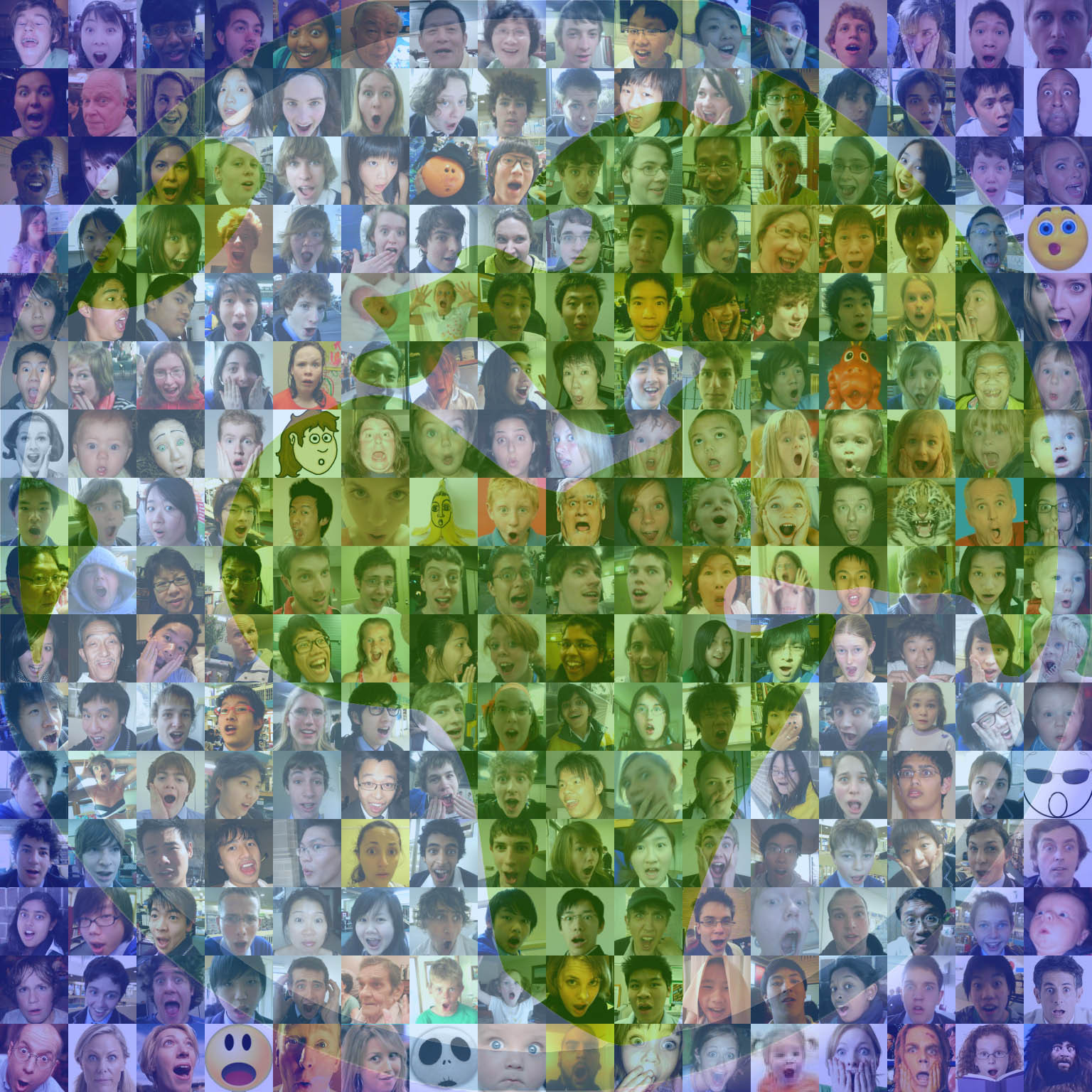 The inspiration came to me with a mixture of alcohol and MSN. One day, I saw Tom's MSN display picture, which portrayed a self-photo of a surprised face. Another friend, Richard, also saw Tom's MSN display picture, and decided to imitate him and took a self-photo of a surprised face as well. Then, coming back from a party, having had a little too much alcohol, I remembered Tom's picture and also took a self-photo of a surprised face. Then it hit me, why don't I collect all the surprised faces I could, from all the people I know, and with it, create a picture of mass destruction?