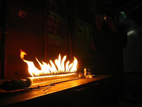 I identified this other problem, which is that we're building a giant sculpture with flaming sound tubes and nobody is sure what hole sizes work best. So we made a bunch of plastic Rubens tubes and set them on fire.
