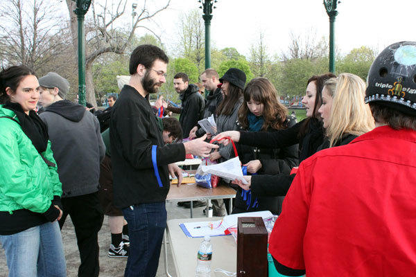 The event began in Welles Park, where folks gathered to register. The official start time was at 7:00PM, but people were encouraged to show up early (and I understood why, once we arrived). Liz was kind enough to drive both me and Jake over, and hung out with us while we were waiting in line.