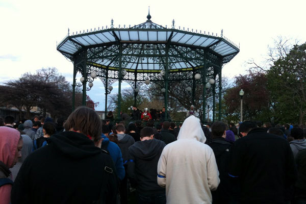 Looking out over the area in front of the gazebo, registered runners were milling about discussing strategy.