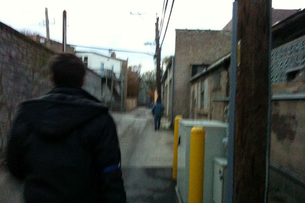 A blurry shot of us going down an alley. Our initial plan of being hidden worked out well, but took us way out of the way. We spent a LOT of time going through alleys and didn't arrive at the first checkpoint until more than an hour later.