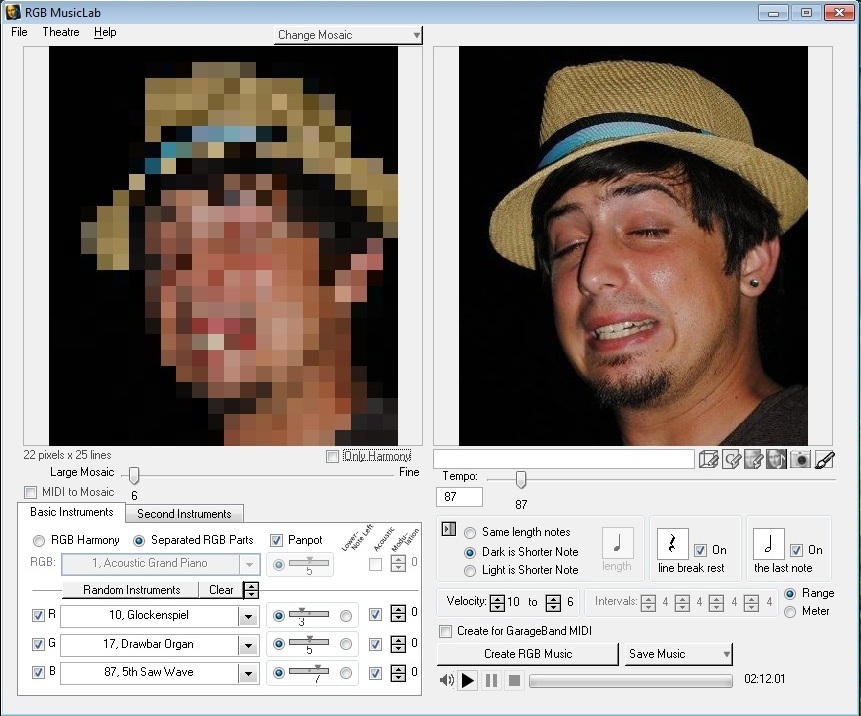 I used my player picture and set the pixels to 22, my age. I picked the instruments using my birthday, 10/17/87, and the tempo is my weight in kilos.