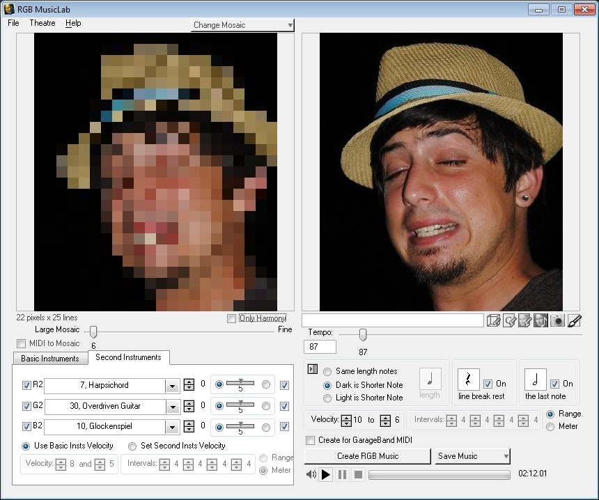 For this task, I used a program called RGB MusicLab. I had heard of it awhile back but never messed with it, and it turns out that it is a pretty nifty application. You feed it a picture, which it pixelates and creates a mosaic out of. It then reads each pixel and from the RGB color values outputs notes, creating a sound composition from the photo mosaic. There are a lot of settings to play with, and I tried to use those settings to make this piece sound more like "me". This is the "Ballad of the Bear Farmer".
