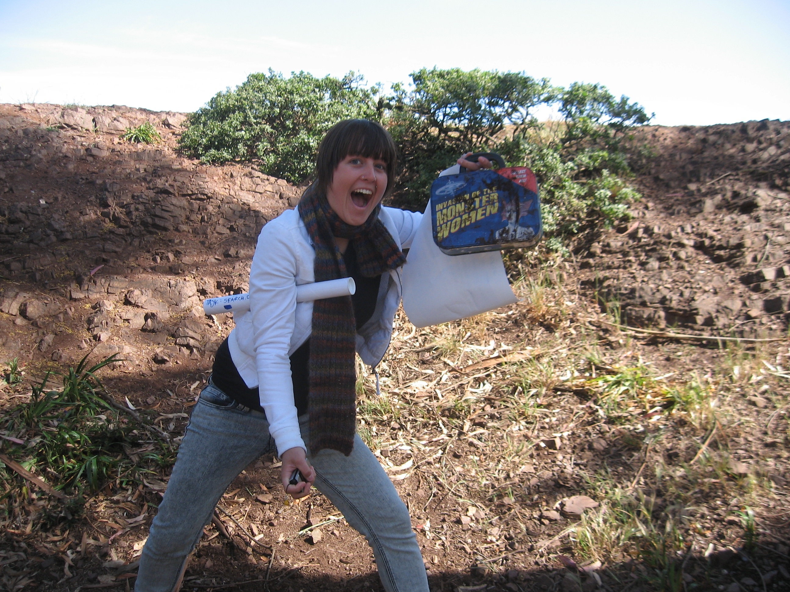 found a poster in my mailbox, which mysteriously said i was part of a race. it listed coordinates with the clues: "in between a tree and a bush" "attack of the monster women."