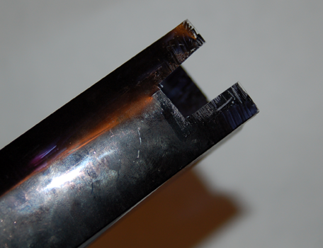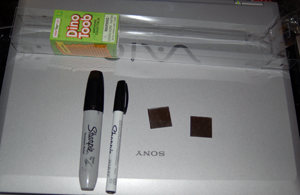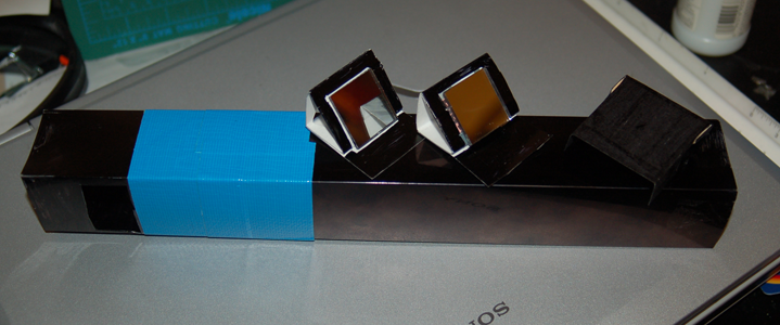 I covered the tube in black sharpie to block out light from the environment, and covered the original label with some appropriately scaly looking duct-tape-esque tape. I also mounted the mirrors on some 45-degree-angled bases and made a cover for one of the ends (the other I just covered with tape.)