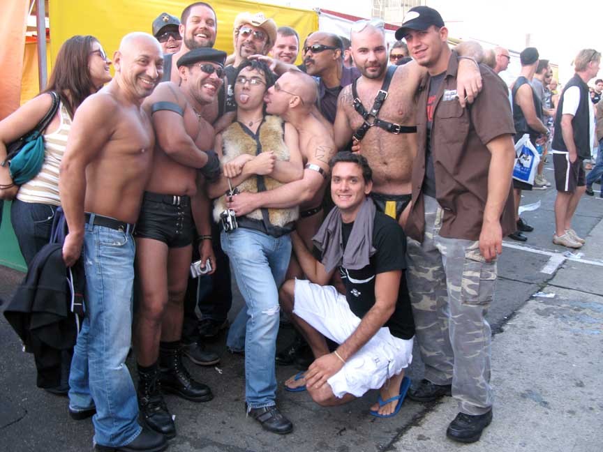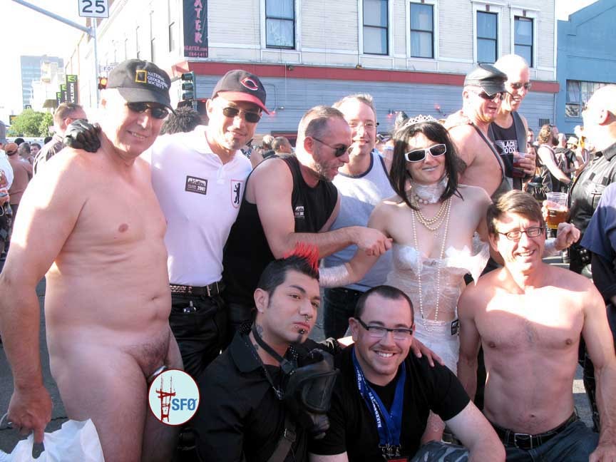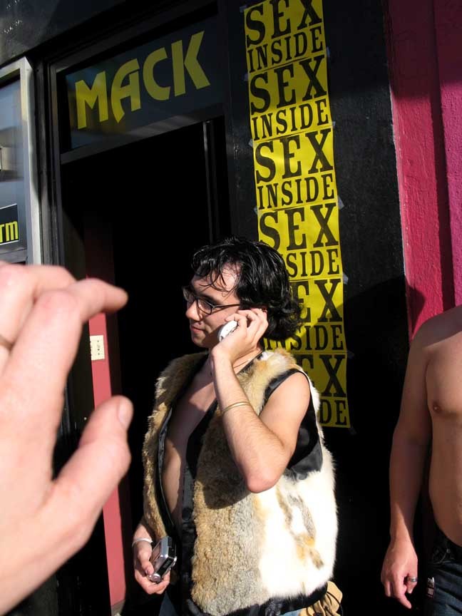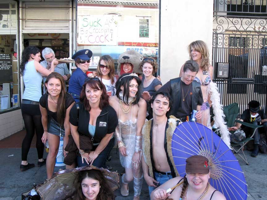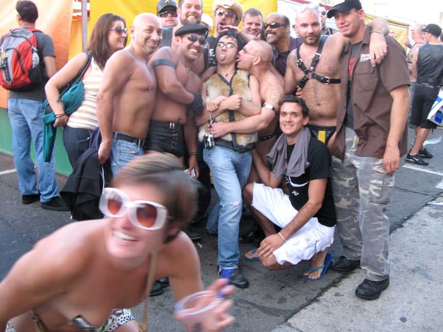 And we arrive at the the Folsom Street Fair part of the story. In which Bex is dressed only in bubble wrap (A tight little package!) and her taskin' pearls. Yes, that's right. Boobies.