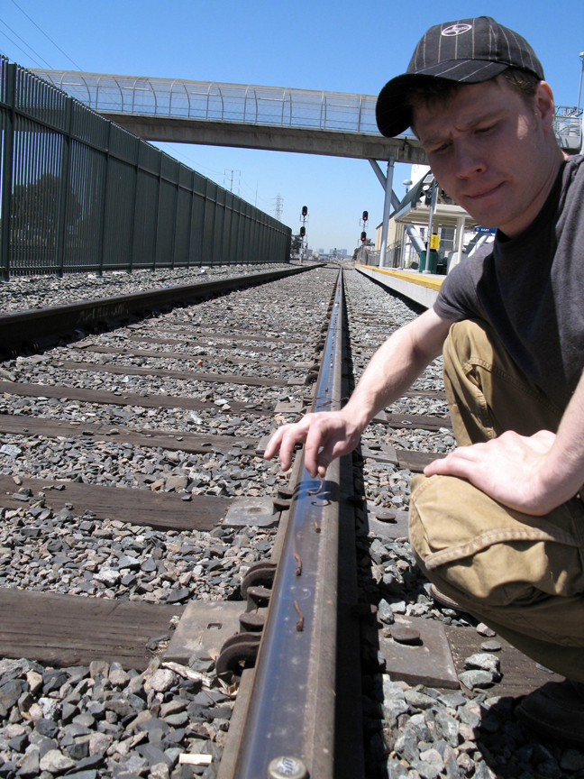 He put down the bags and began rifling through his pockets. He casually walked over to the tracks, looked around, and non chalantly lay the first item down. A glance at Bex and both began looking for metal items on the tracks. Unsure of whether we would derail the train, we were conservative. Just a few pennies and bottle caps and nails. With the thought that this was probably illegal, an extensive affected casualness was undertaken, though this may have been silly and unneccessary considering the drug deals that appeared to be going down in frequent succession further down the track.
