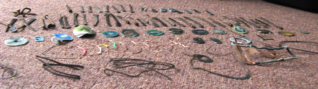 As it pulled out we scampered with uncontrolled excitement to the track to collect. Neato nails that looked like swords. There was a beat of silence between us as we stood over our loot. Then we frantically ran back to the track and collected all the metal items we could find. Which was a lot: we are both gifted at finding things on the ground (thank the heavens we found SFØ!). Nails and bottle caps mostly, but the real prize was the wires, which we coiled around themselves into pretty shapes. We crossed nails over each other like swords in a coat of arms and covered both tracks with items for about 25 feet.