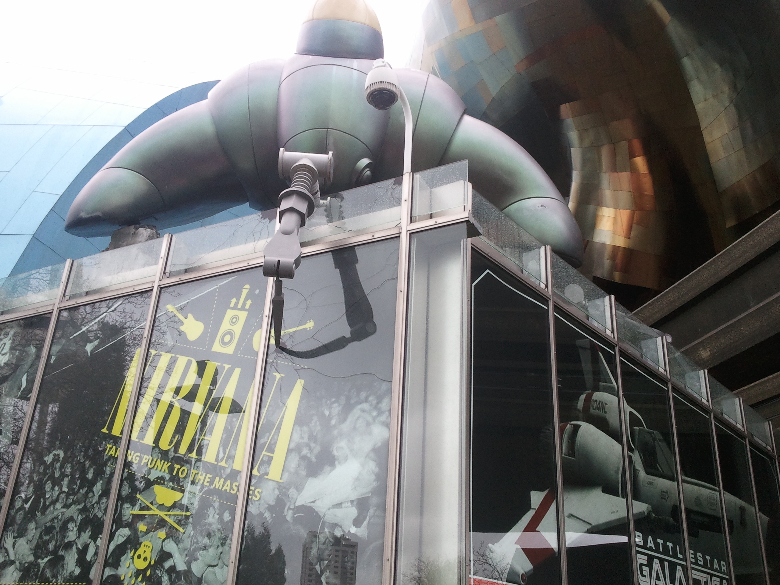 download file The Nirvana exhibit billboard for the Experience Music Project is under attack by the giant robotic bug for the Science Fiction Museum... which is how things were for Nirvana during their heydey, too. |