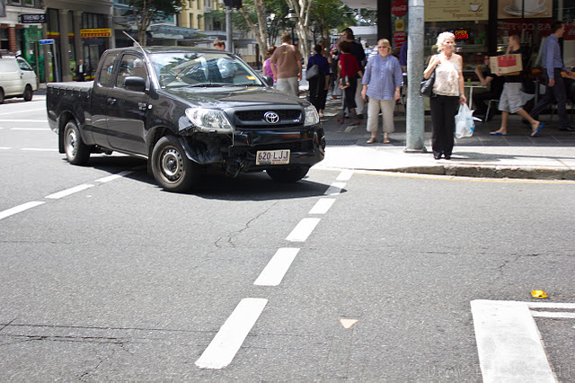The noise of the protest has faded away and this damaged Toyota rounds the corner. its blacked out windows do not show the careless owner.