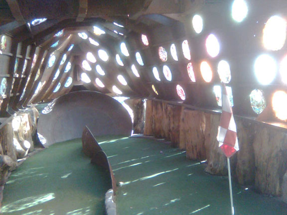 The sun streamed through caned glass windows. You have to bank your golfball off the altar.