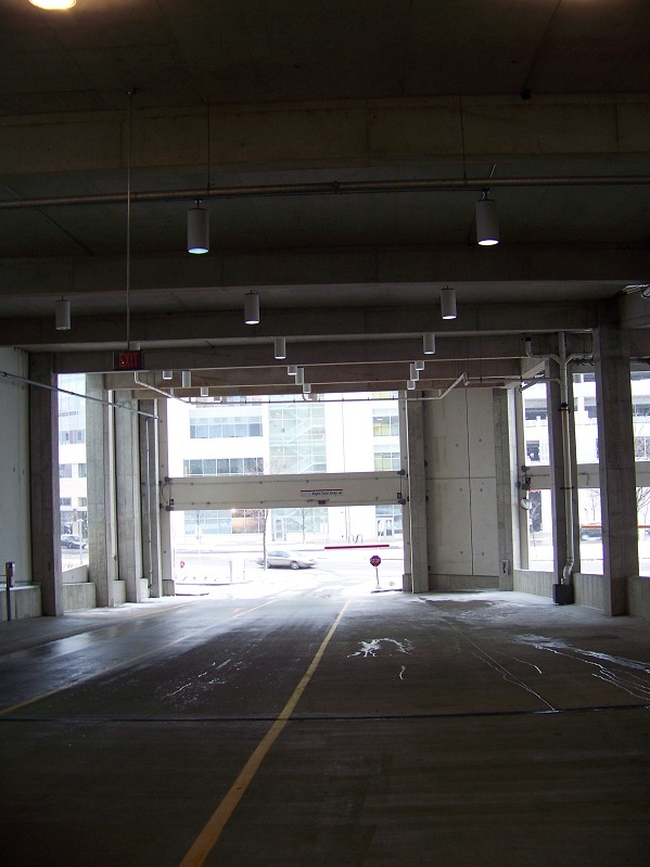 We walked through the parking structure and arrived at this ramp. It was a huge slope, maybe 150 feet long, at a ridiculous grade. We sped up to the bottom...