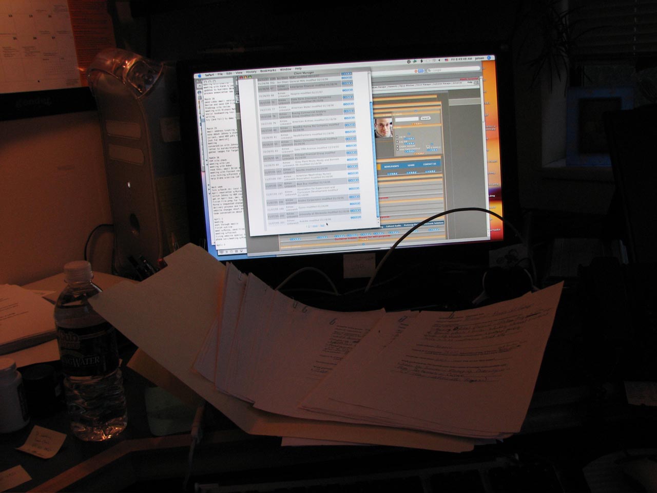 client reference files fanned out in foreground, web dbase on screen. time stamp on screen reads 06:49.
